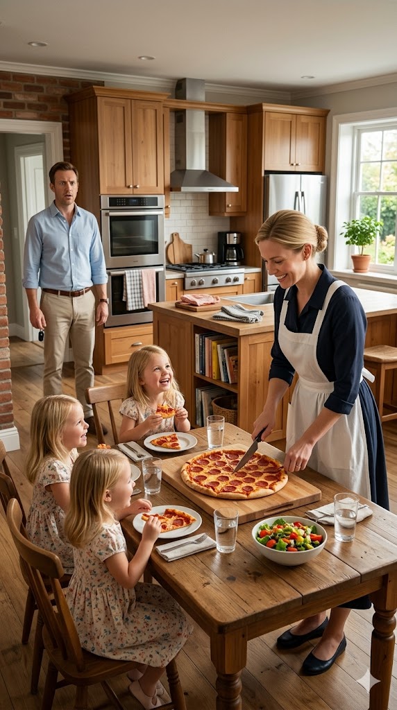 The words felt unfamiliar. But right. “I want my daughters to grow up like this,” he said. “Not managed. Not controlled.” He glanced at the girls, laughing over uneven slices of pizza. “Happy.” Clara didn’t answer immediately. Then she said, softly, “That’s not something you hire, Mr. Whitmore.” Daniel nodded. “I know,” he said.