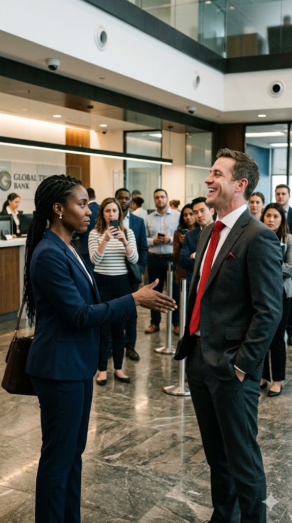 The Google reviews for First National Trust had begun to spiral downward. The bank’s rating dropped from 4.2 stars to 3.1 in just six minutes. Corporate would catch the algorithmic alert within the hour. Jasmine finished assisting her customer and stepped forward. Three years of watching similar scenes had finally pushed her to her limit. “Mr.—”
