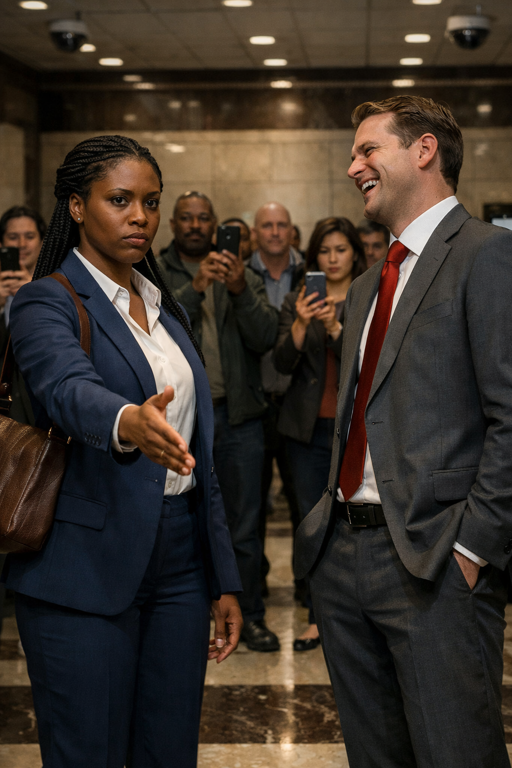 Dr. Amara Kingston remained there, her hand hanging in the air for exactly three seconds. A worn leather briefcase rested on her shoulder. Her modest blazer seemed out of place among the designer suits and luxury handbags scattered throughout the bank’s immaculate interior. Branch manager Regginald Whitmore III turned toward the nearby sanitizer station, pressing the dispenser twice while muttering, “Hygiene protocols,” just loud enough for everyone to hear.
