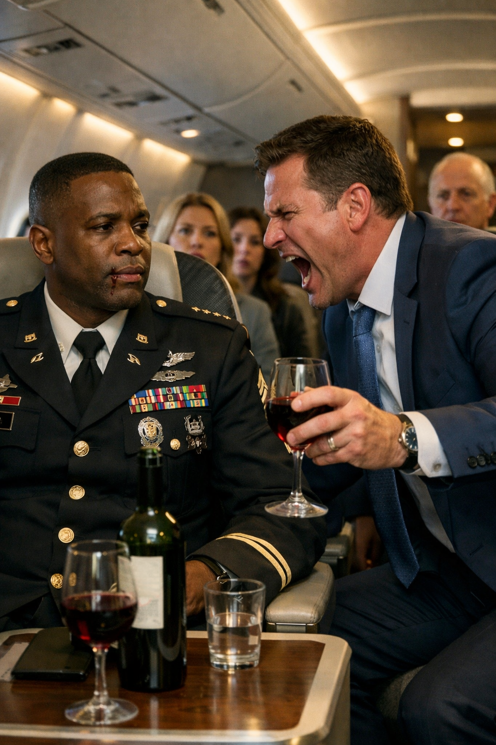 Lead flight attendant Marissa Dunn had approached Gavin Mercer with the professional composure of someone used to difficult travelers. But the moment Colonel Adrian Cole revealed his credential, her posture shifted. Her shoulders squared, her expression sharpened, and she no longer treated it as a routine seat dispute. She glanced from credential to Adrian, then back, and immediately spoke into the interphone.