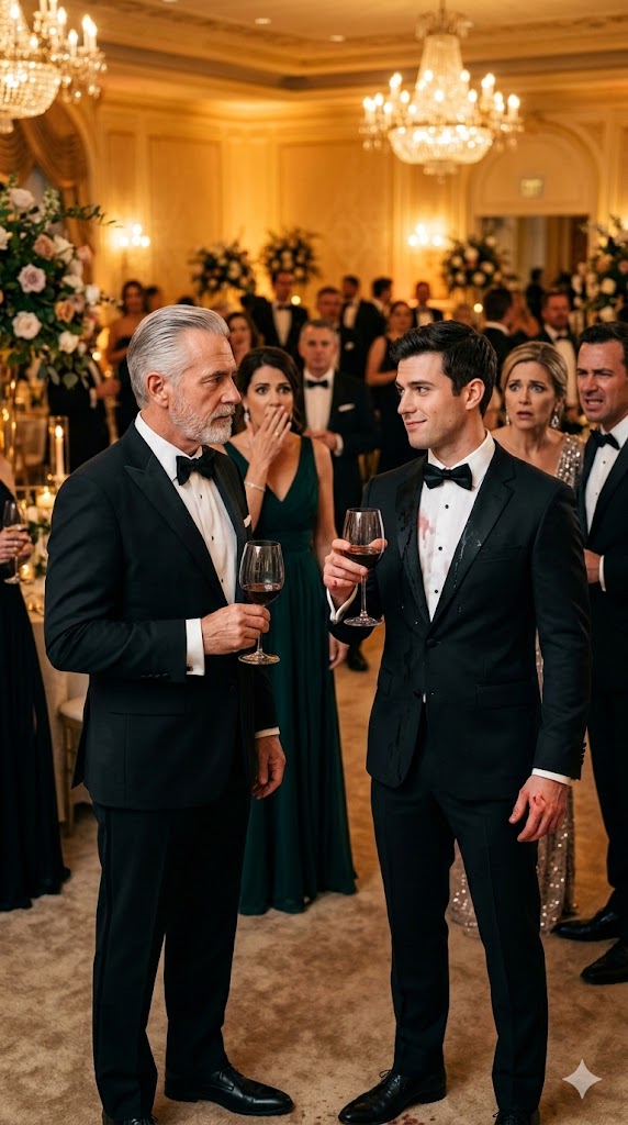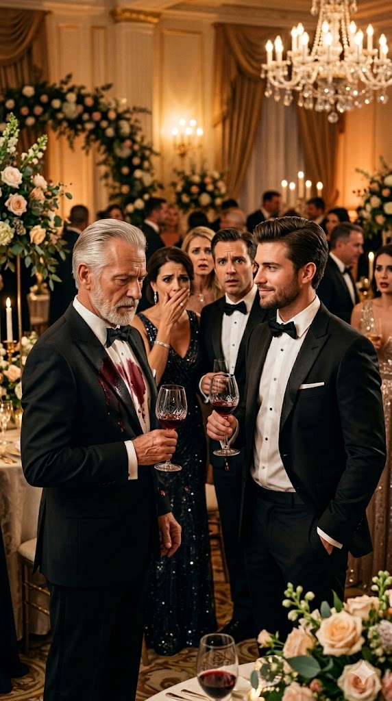 Red wine cascaded down the man’s chest, saturating the suit, dripping onto the polished floor.