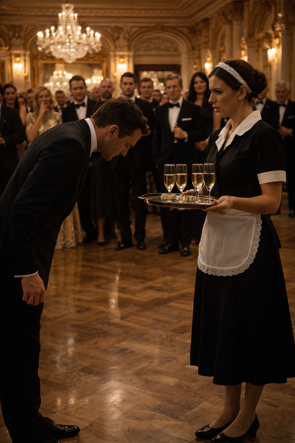 In the kitchen, I tightened the apron with trembling fingers. The tray of champagne flutes trembled slightly in my hands. Beyond the doorway, the house filled with music, laughter, expensive perfume, and voices sharpened by corporate ambition.