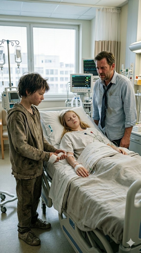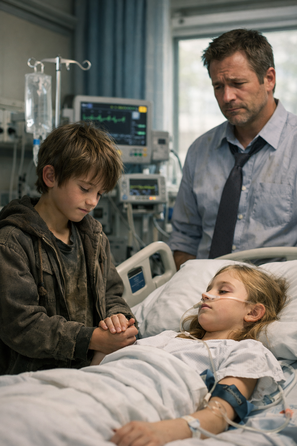 A boy stood in the hallway — around ten years old. His clothes were faded and dusty, his sneakers torn. He looked like a child who had known too many nights outdoors. Yet his eyes were steady and filled with an unexplainable peace.