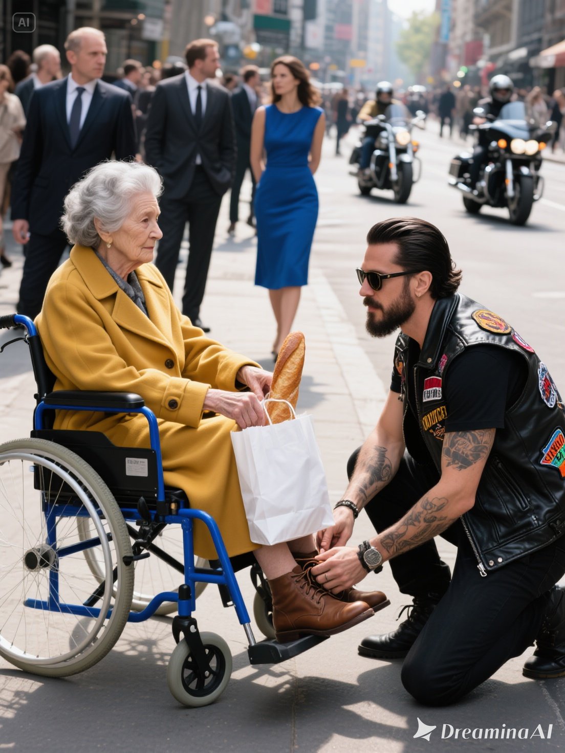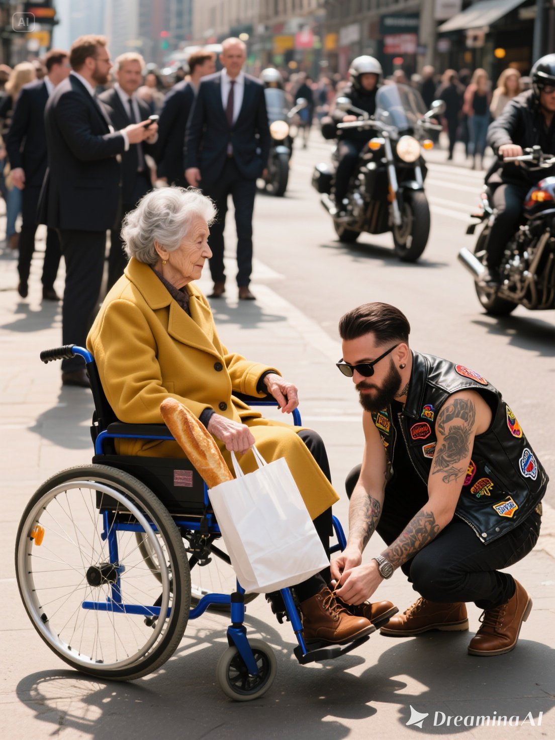 It was a man in a leather vest, tattoos running down his arms, gloves worn from riding. He knelt on the pavement—not hurried, not annoyed—and tied my shoes with the care of someone handling silk.