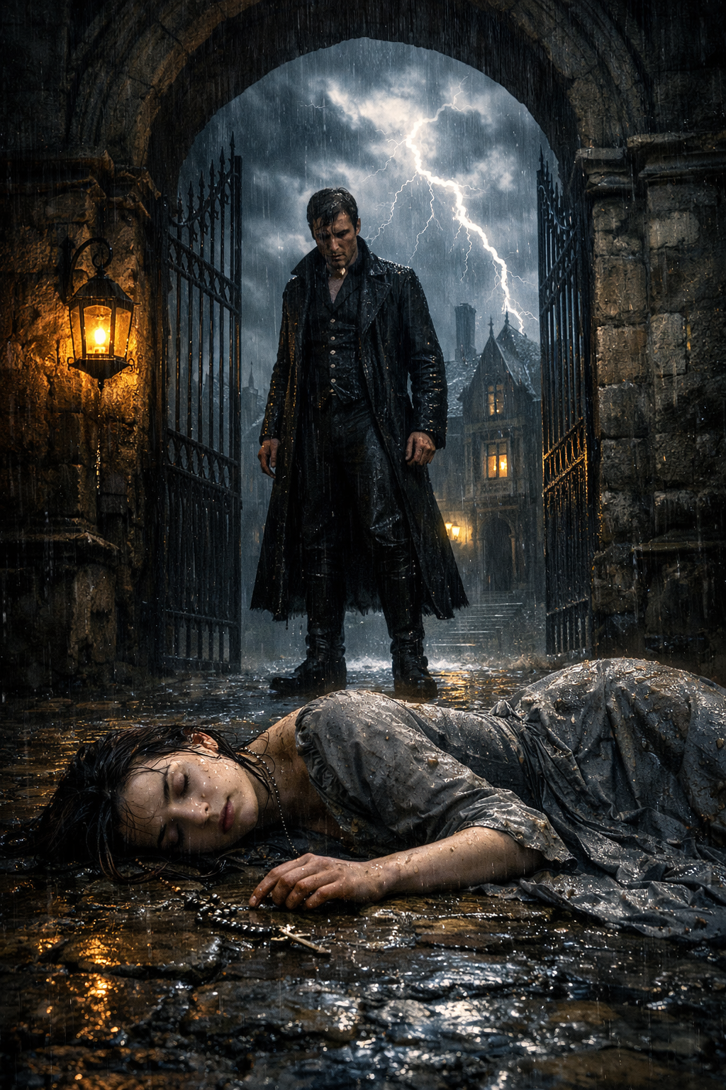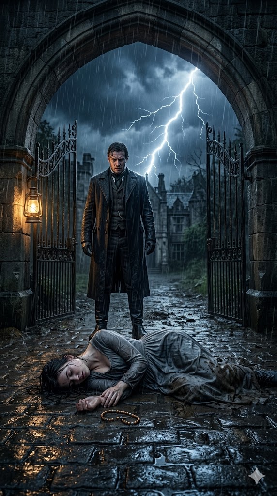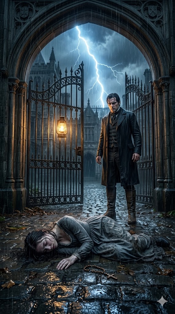 It was Sebastian, the Vance family’s eldest servant, who discovered her during his nightly patrol. At first, he assumed it was nothing more than a heap of discarded cloth abandoned to the wind. But when the trembling glow of his lantern revealed a woman’s face—pale as stone—he stepped back in shock. Soon whispers filled the entrance hall as the other servants gathered. They stared at the soaked young woman like a troubling mystery until Mistress Matilda, the stern yet kind-hearted housekeeper, took command. Observing the fine quality of the torn fabric, the elegance of her injured hands, and the antique silver rosary, she knew this girl was no ordinary beggar. “She has noble blood,” she declared. Ignoring the strict rules of the house, she ordered the girl to be taken to a servant’s room and tended to until morning.