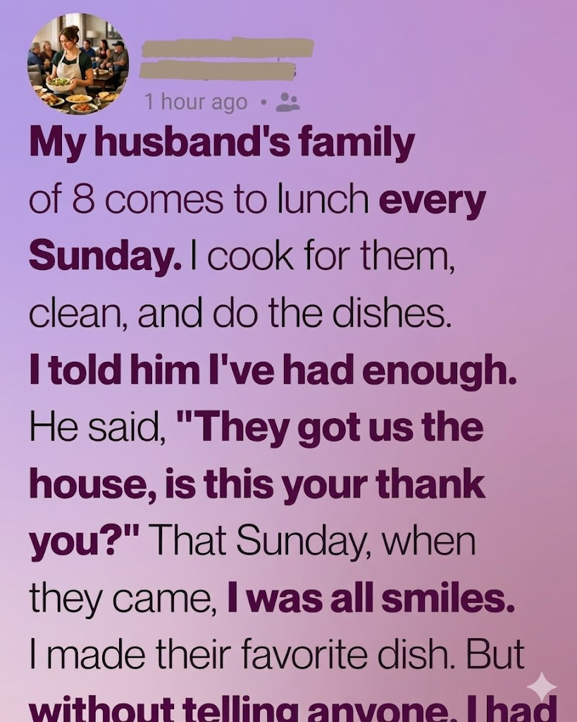 The next Sunday, I woke up early. I went grocery shopping. I cooked all their favorite dishes—everything just the way they liked it. I smiled when they arrived. I laughed at their jokes. I played my part so convincingly that no one suspected a thing.