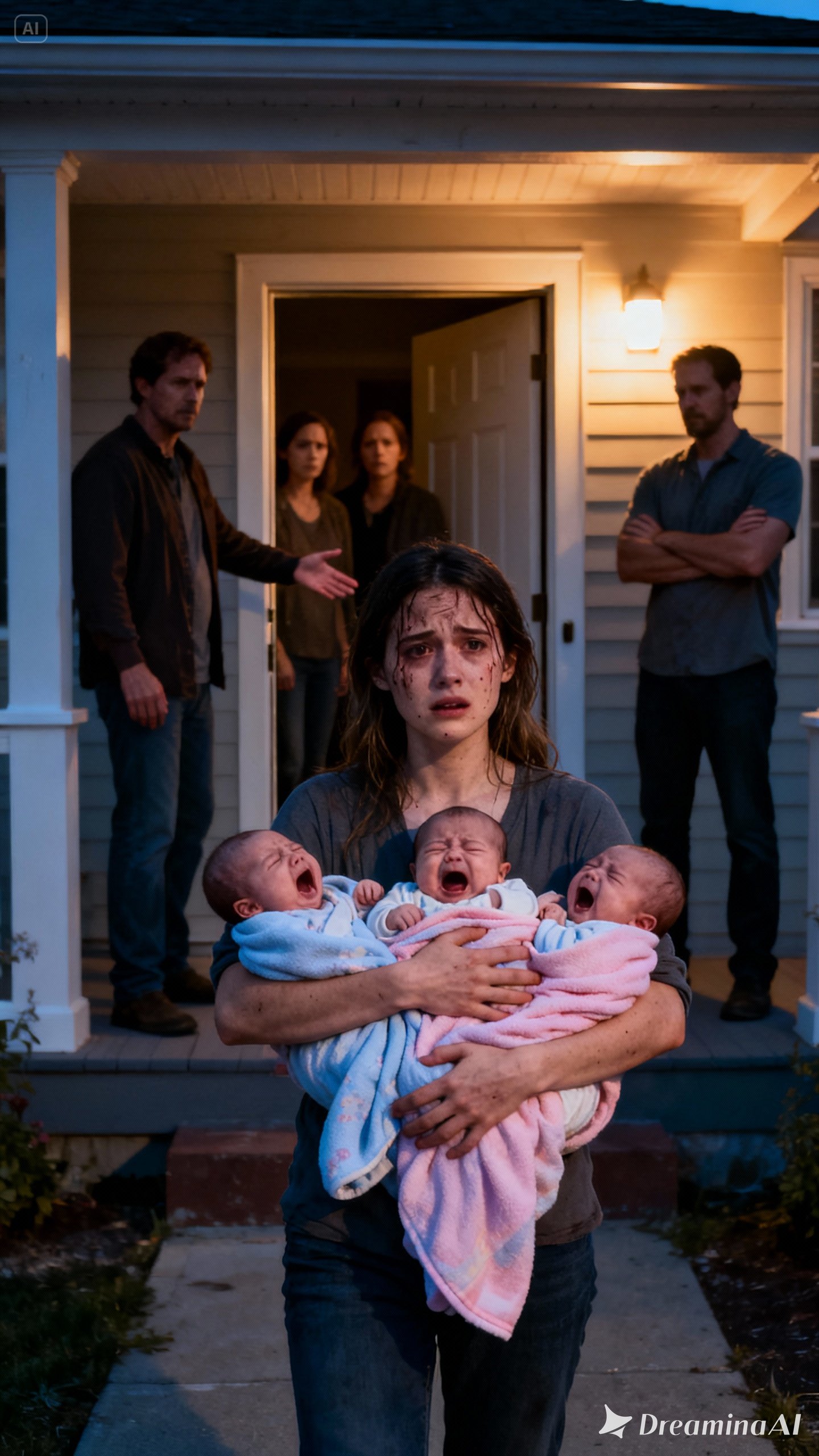 On the wall beside the door, the digital clock glowed 12:03 a.m. It was officially past midnight. barefoot, weak, blood on her legs, three wailing infants clutched in her shaking arms. The night air cold enough to sting her skin. She stood there trying to stay upright and then her knees gave out. She collapsed onto the wooden porch, curling around her babies as best she could.