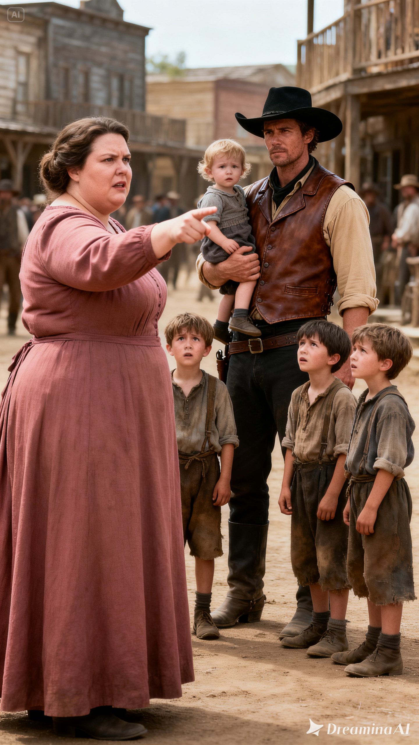 She stood near the wooden porch of the general store, her burgundy dress stretching over her full figure as the breeze tugged gently at the hem. Her dark hair was tied back in a neat bun, though a few loose strands brushed her cheeks.