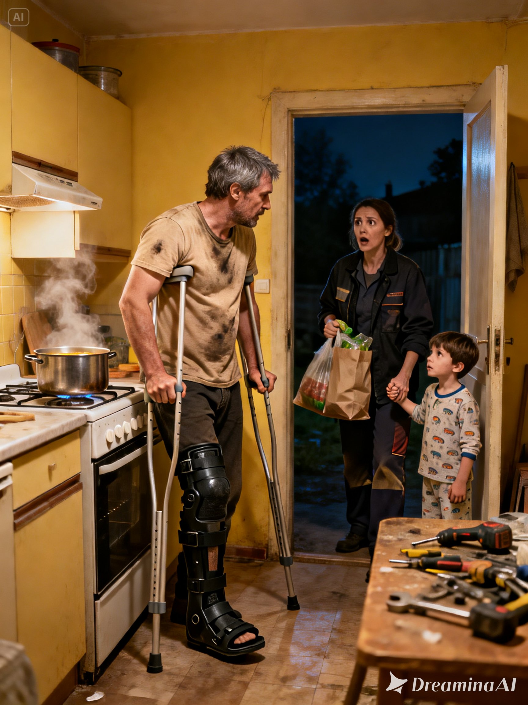 Derek stood at the stove wearing one of my oversized T-shirts, his brace strapped on, shifting carefully to keep his balance. A small loaf pan rested nearby. When he noticed me, he raised his hands slightly, palms open—nonthreatening.