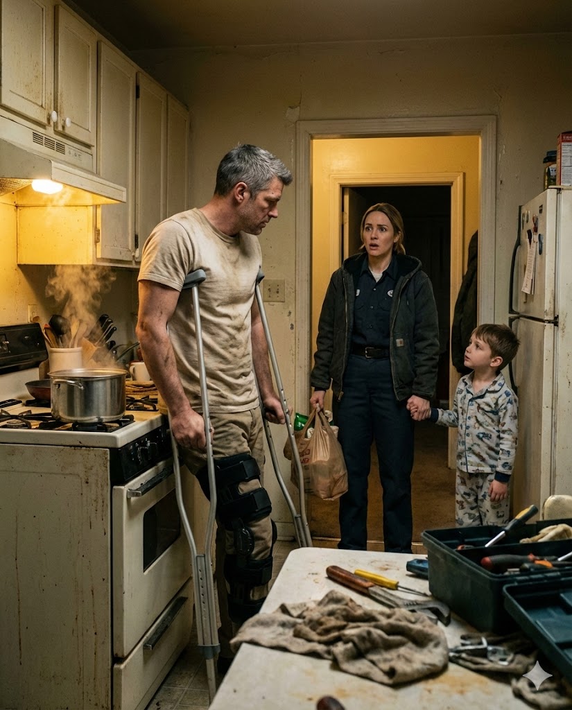 I glanced at Derek across the small kitchen, his brace resting against the wall, his hands steady as he stitched a torn backpack strap.