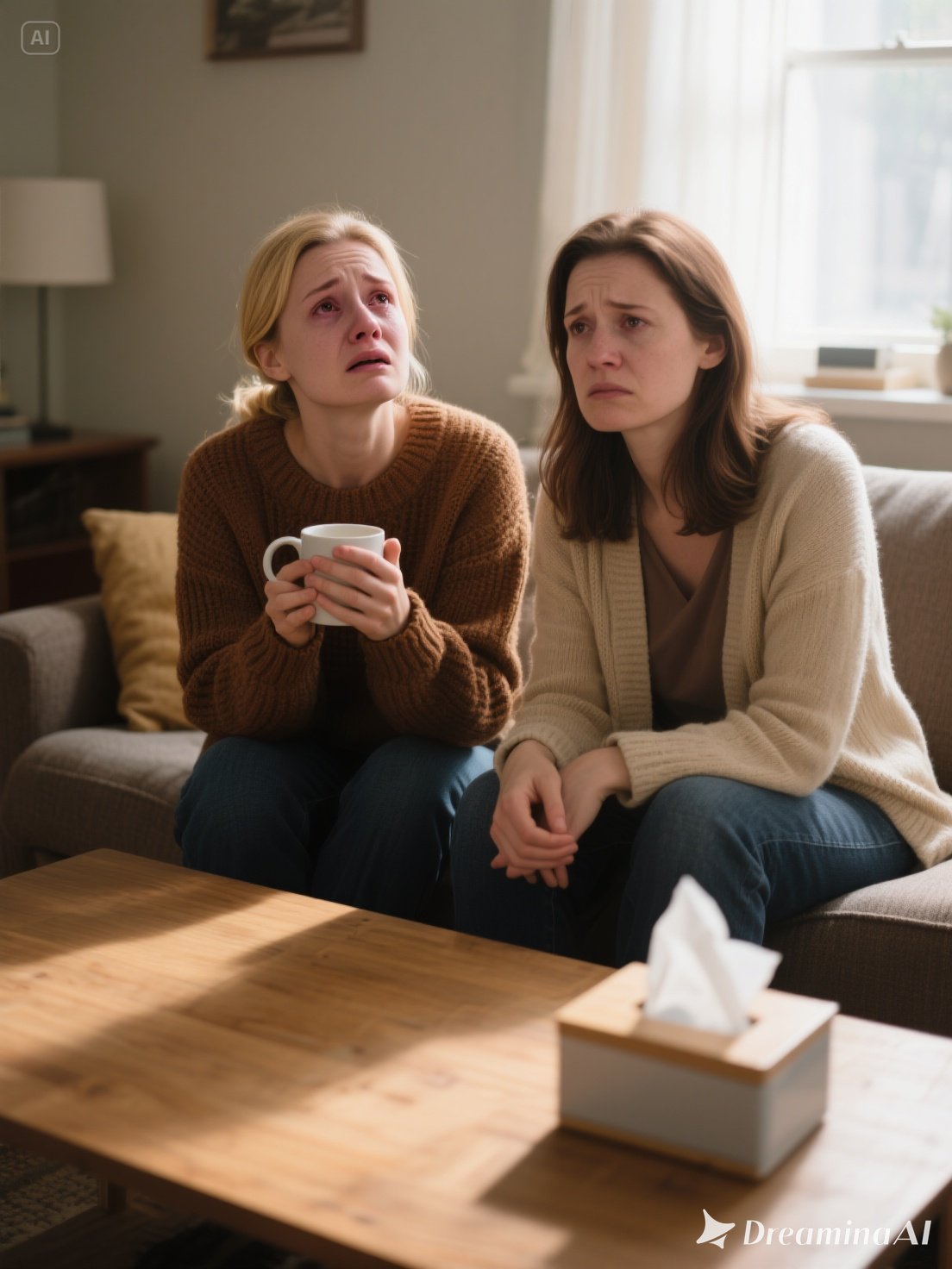 Both of them had swollen, red eyes. Tear-streaked faces. A tissue box sat between them on the coffee table like it belonged there. The air smelled of chamomile and honey.