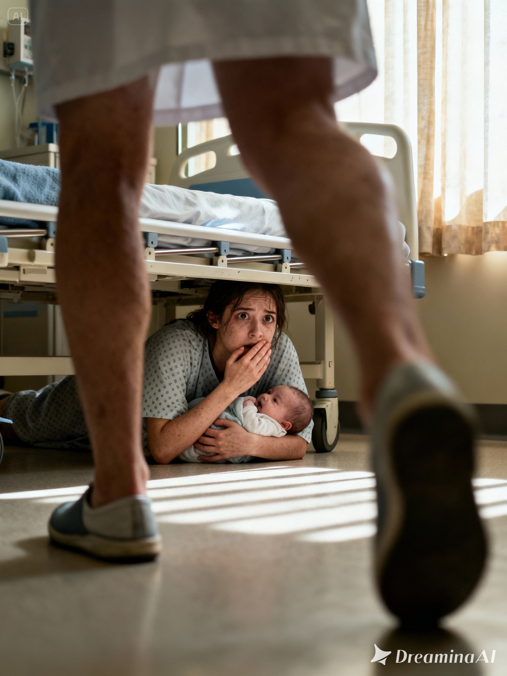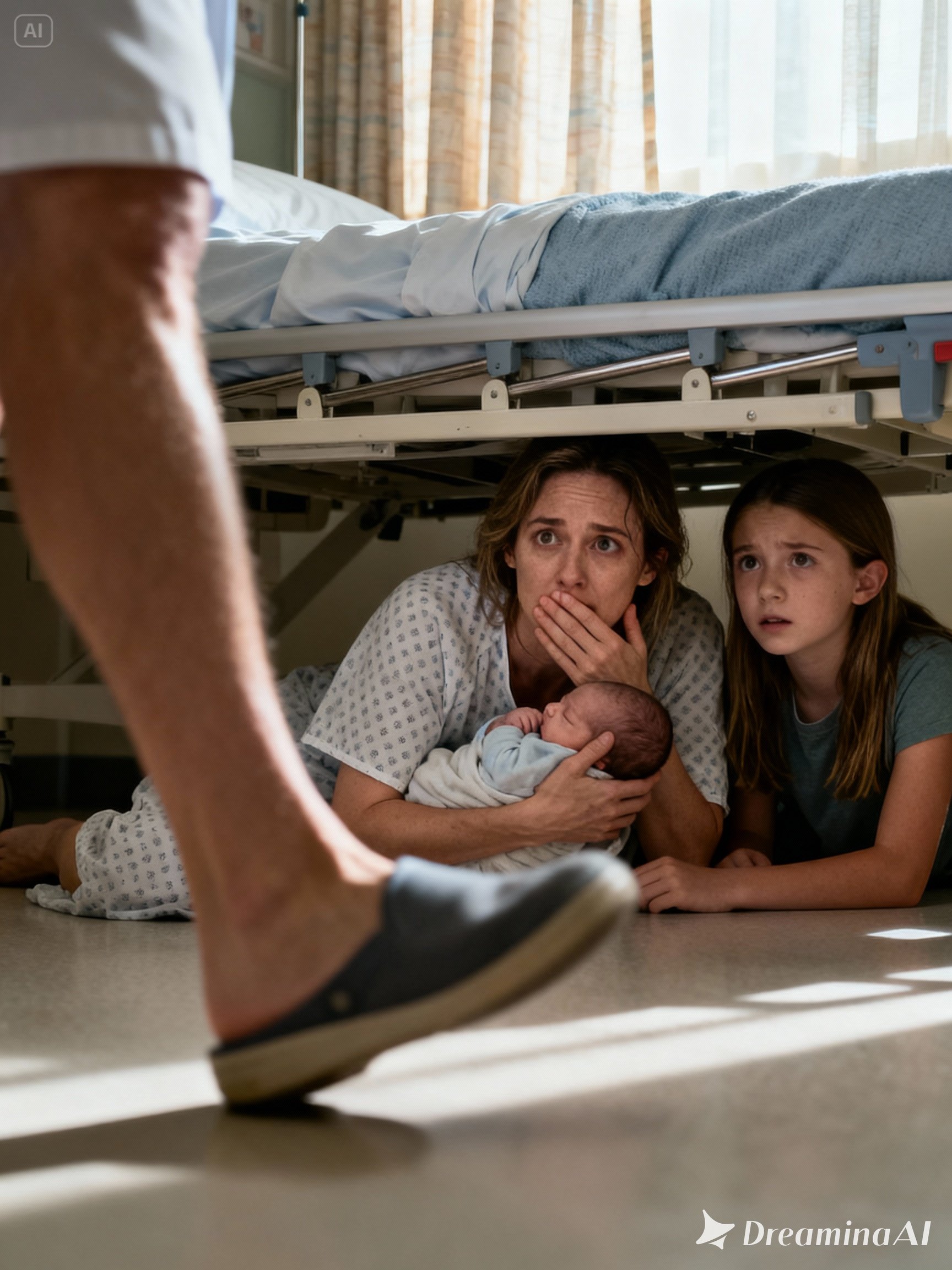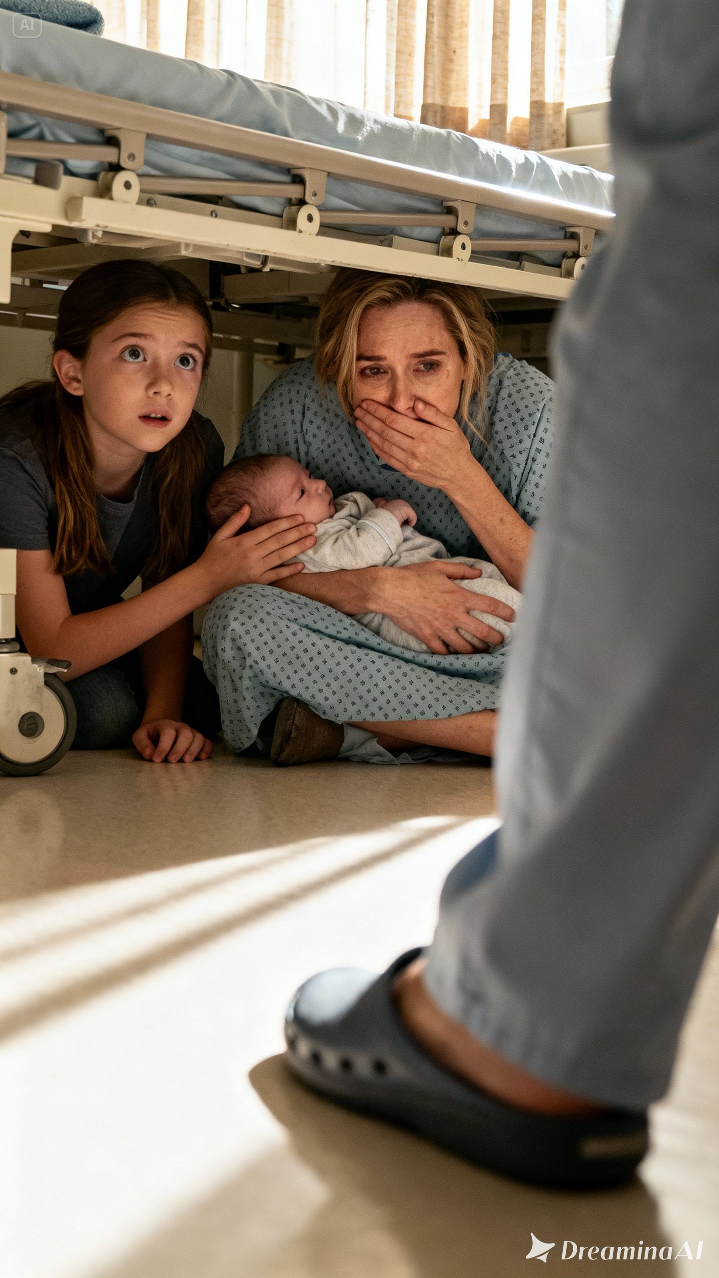 It was agony. My stitches burned as I slid off the mattress, dragging the IV pole with me, praying the line wouldn’t tear from my vein. I curled into a ball on the cold linoleum, clutching my newborn son. Lily scrambled in beside me, pressing her small hand over her mouth to stifle her breathing.