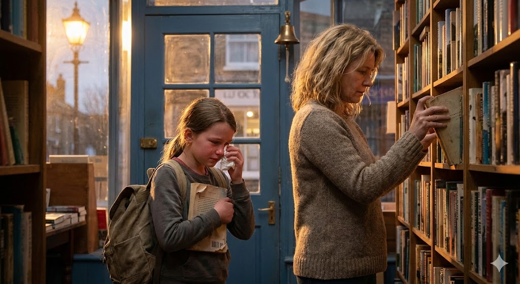 The bell above the bookstore door rang softly as I organized the classics shelf, late-afternoon sunlight cutting through the dusty windows. It was usually my favorite part of the day—still, peaceful, the kind of quiet that only exists between shelves of books. That’s when I noticed her.