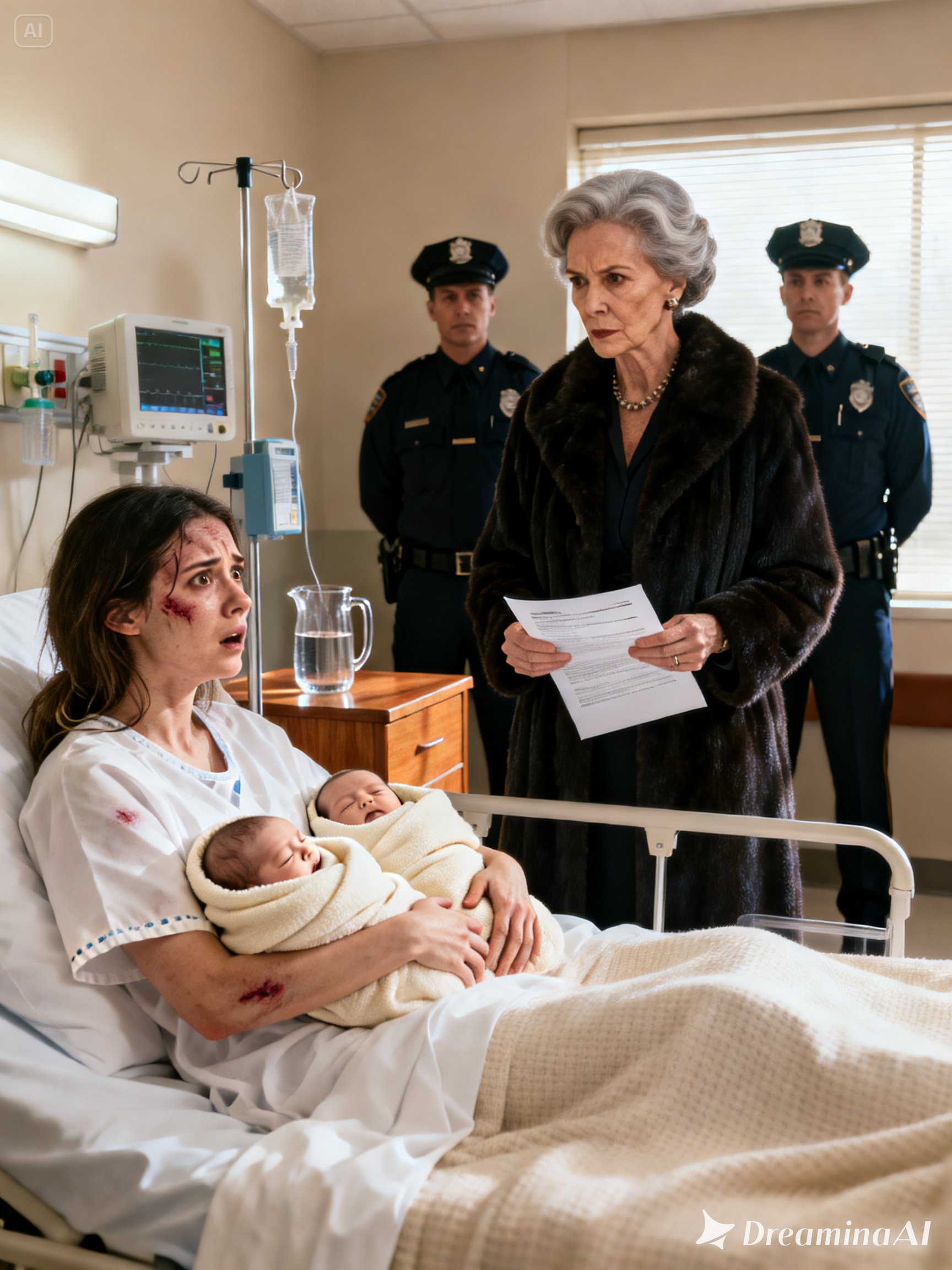 The guards studied me. I was pale, blood seeping where the IV had been tugged, my hand pressed to the swelling mark on my cheek. Then they turned to the older woman in fur, sobbing dramatically.