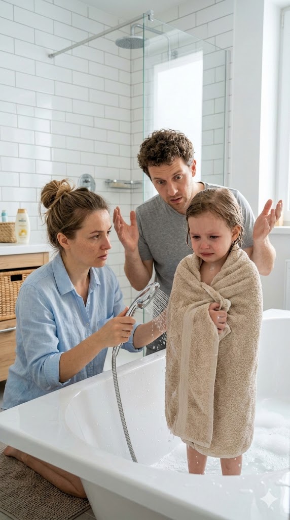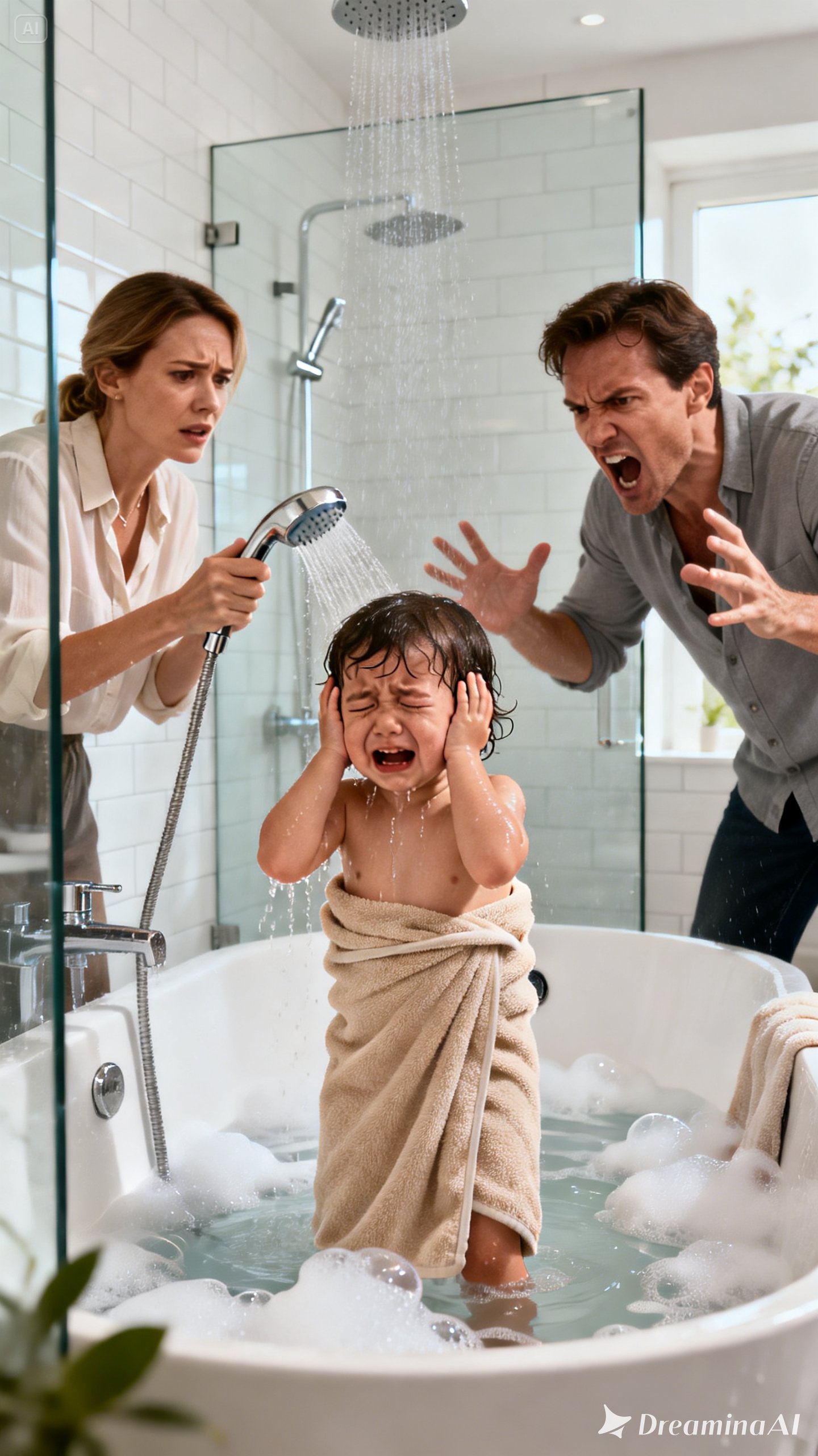 Steam clouded the bathroom. Lily lay naked on the bathmat, curled tight, her cheeks and chin blazing red. Chloe stood nearby, holding the shower head as casually as if she were demonstrating something—not towering over a frightened toddler.