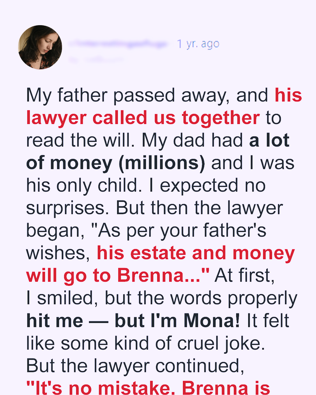 I always thought my father’s will would secure my future. Then, when the lawyer read the name of someone I didn’t recognize, everything changed. My grandmother’s fury was immediate. Who was Brenna, and why did my father leave everything to her? And what secret was hiding behind it all?