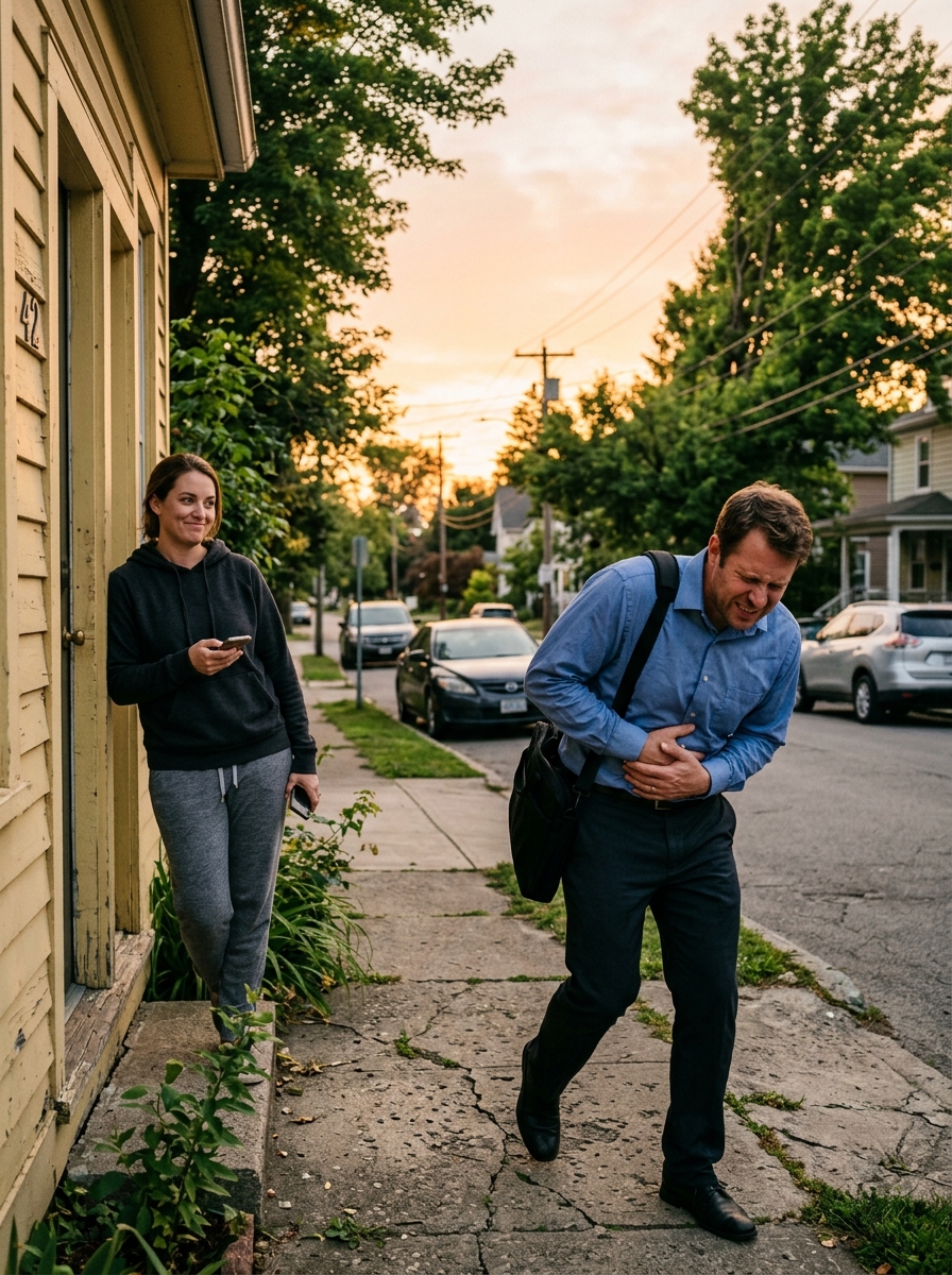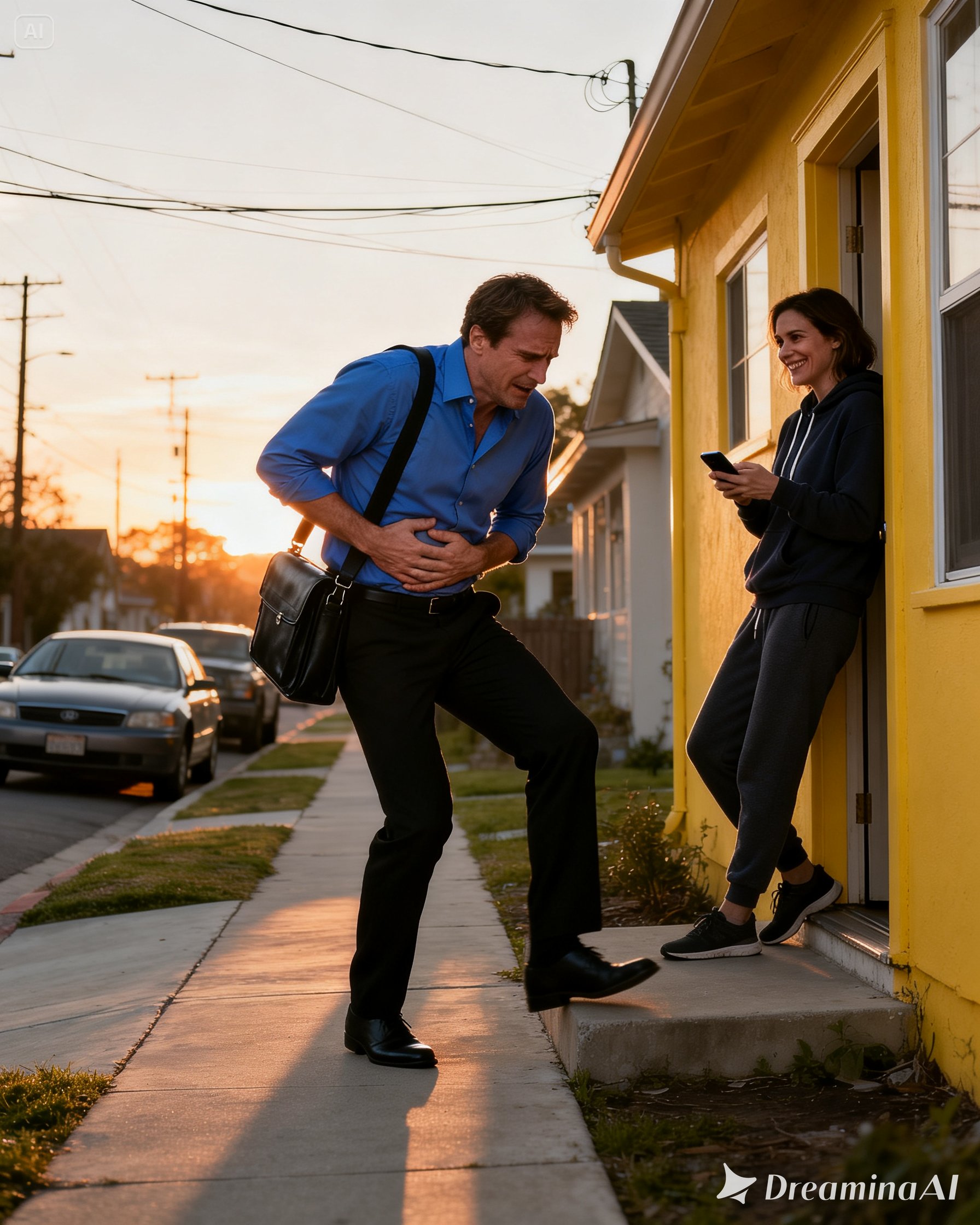 My husband—the great executive full of “synergy”—struggling up the stairs as best he could, his pride shattered, his stomach in knots… and his “important meeting” clearly cancelled.
