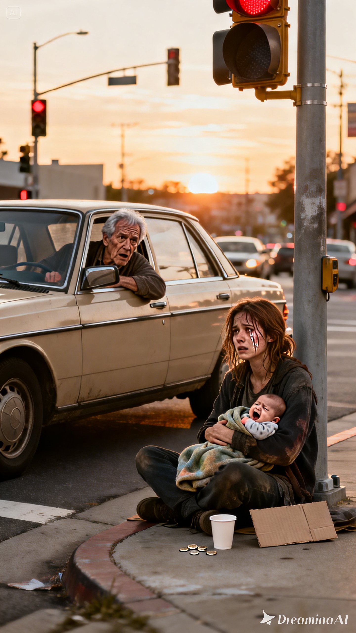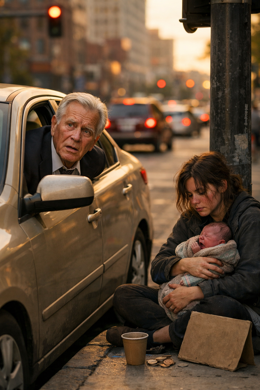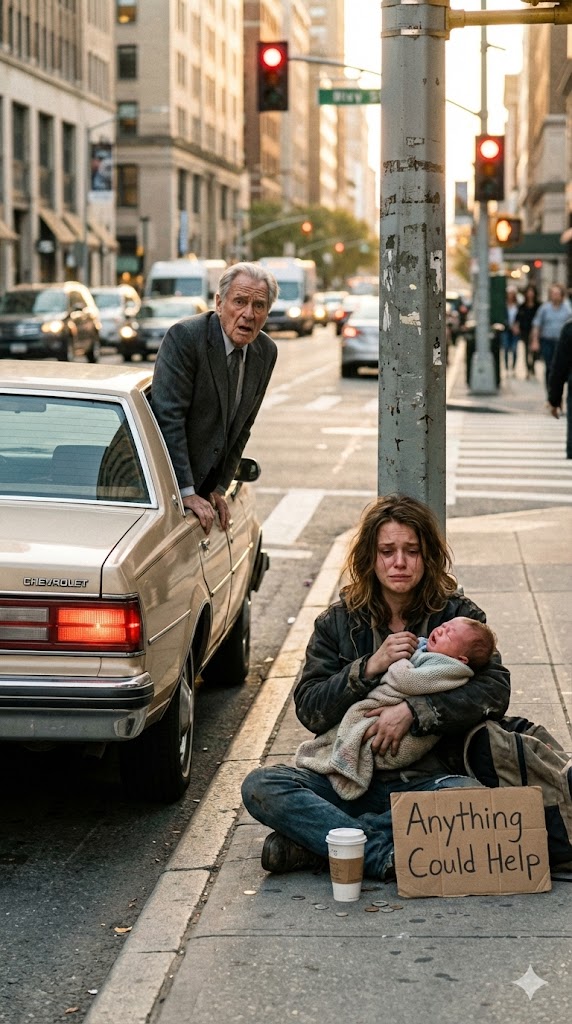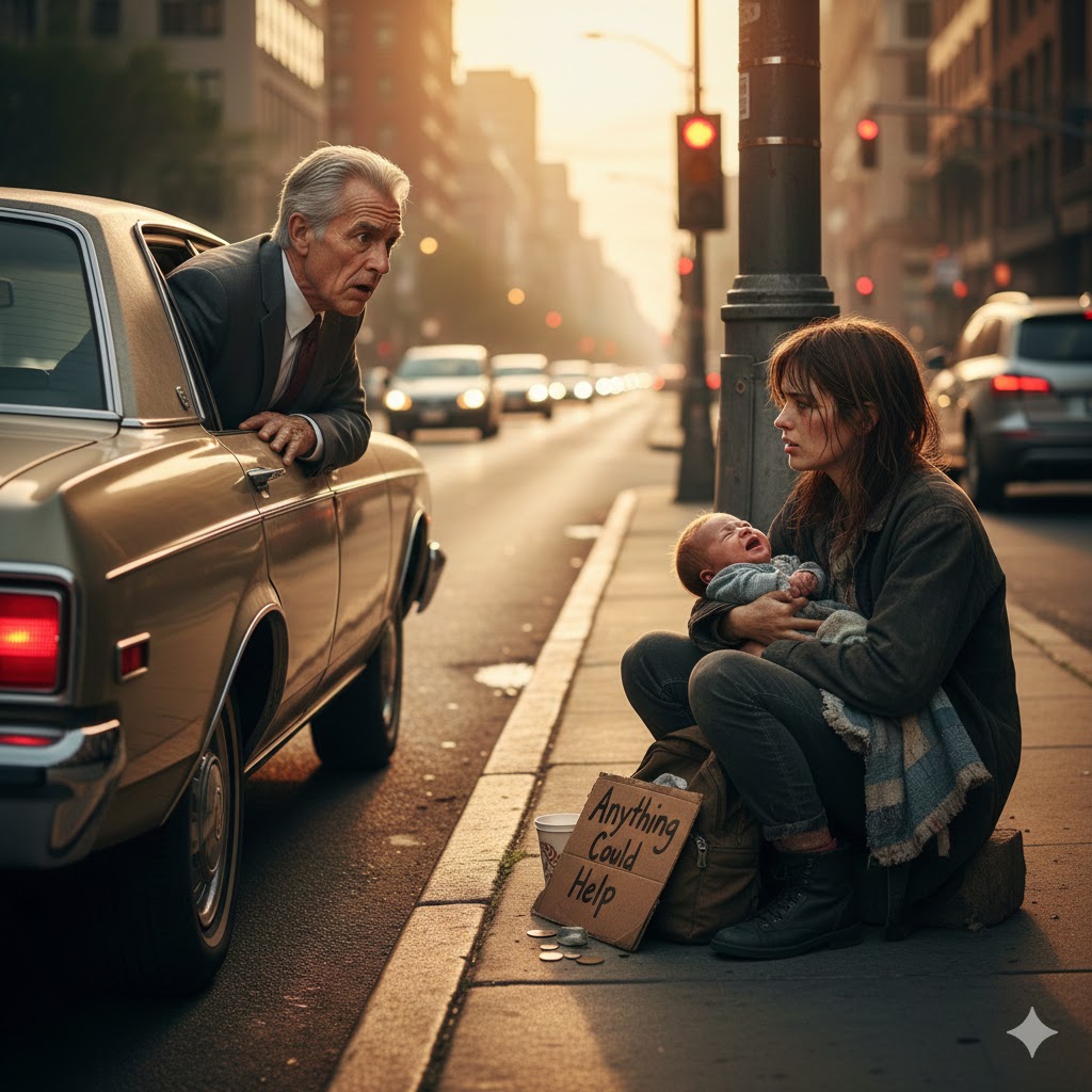 I drummed my fingers lightly on the steering wheel, worn out from a long day, when a figure on the sidewalk drew my attention. A young woman stood by the curb, her head bowed, one arm supporting a baby, the other extending a small paper cup with a few scattered coins.