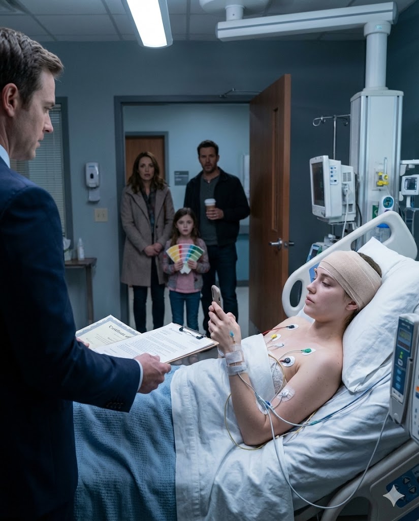 Two hours later, my parents arrive like they’re visiting someone in a regular hospital room after a minor surgery. My mom’s hair is styled, my dad is holding a coffee cup, and their faces look irritated rather than worried. Behind them, Hailey drifts in like an accessory they couldn’t leave at home. She’s wearing oversized sunglasses indoors, and she’s clutching a bag of paint samples like they’re priceless artifacts. My mom smiles too wide, too late, and reaches for my hand. I pull my hand back, not violently, just decisively, and the small movement feels like a boundary being born. My father narrows his eyes at Matthew. “Why is he here?” he demands, as if Matthew is an intruder in the family drama. Matthew stands, polite but unshakable. “I’m here because Lauren requested legal counsel,” he says. “She is updating her medical power of attorney, estate plan, and next-of-kin authorization.”