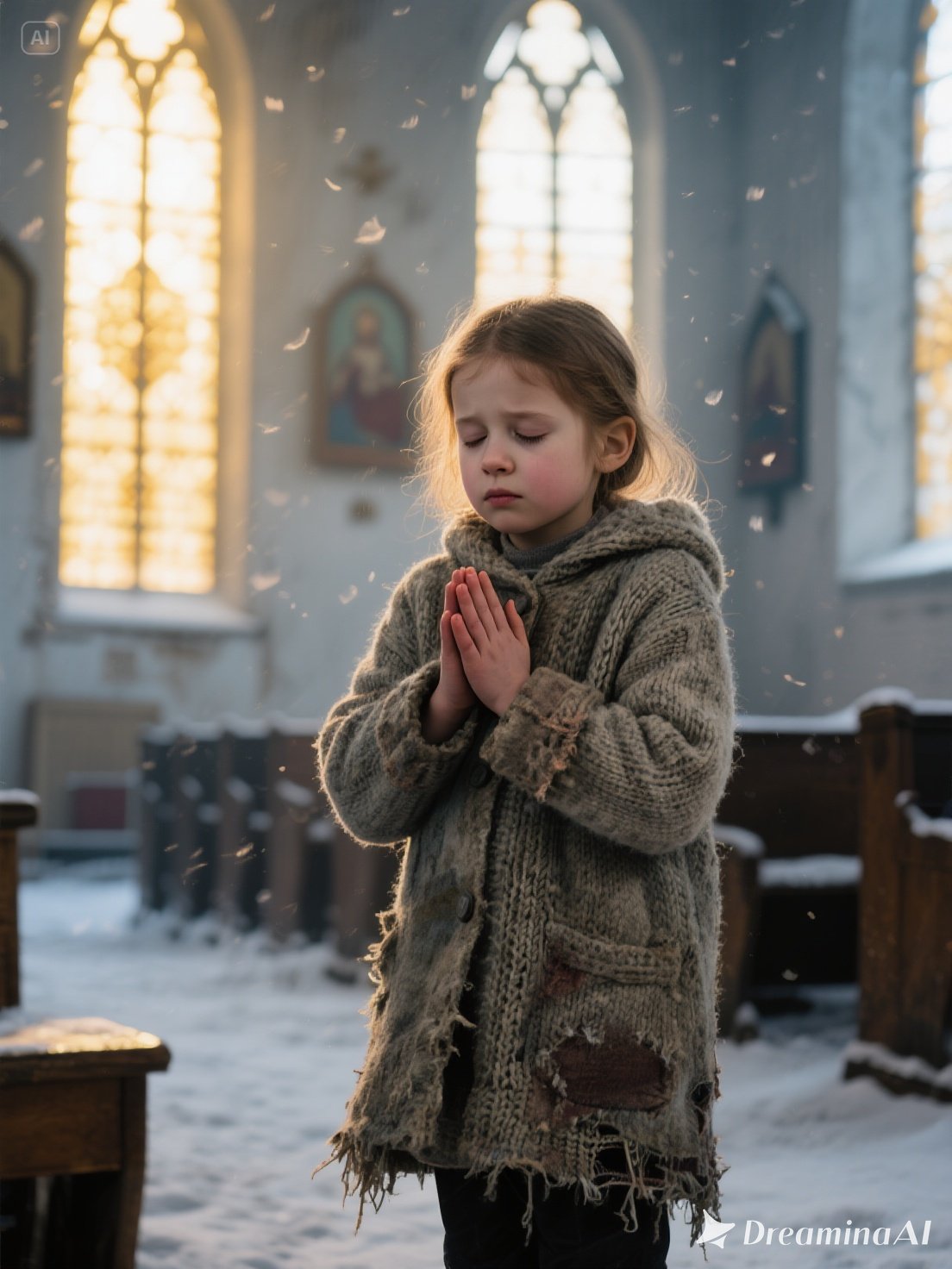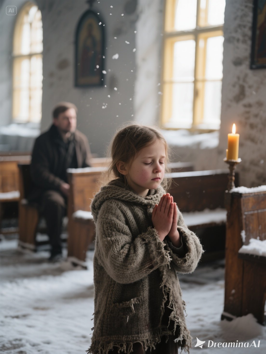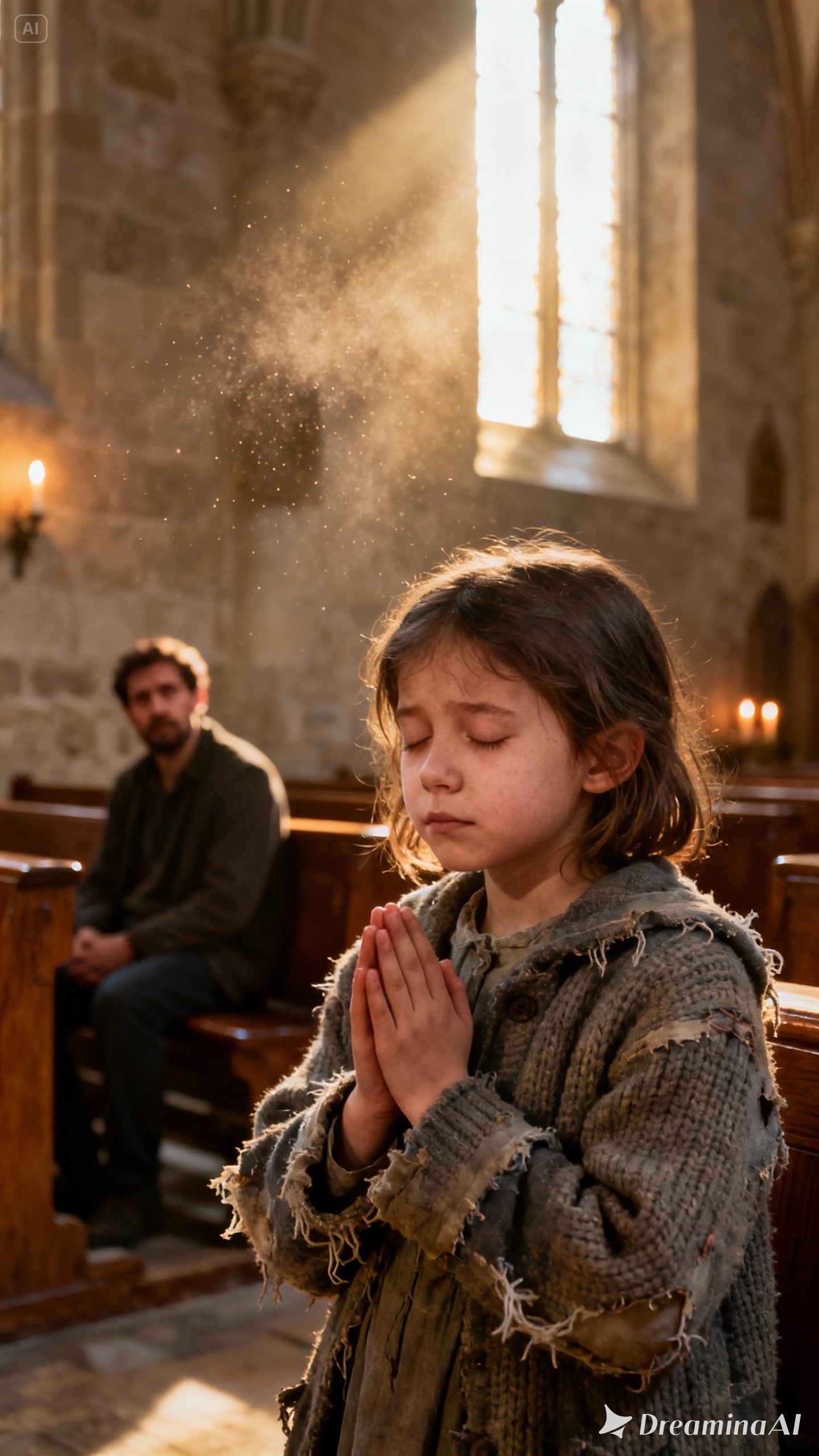Two rows ahead, slightly to my left, a tiny figure knelt alone. She couldn’t have been older than six. A faded pink beanie clung to her head, the wool stretched and worn thin. Her coat was clearly too small, straining against a body still growing.