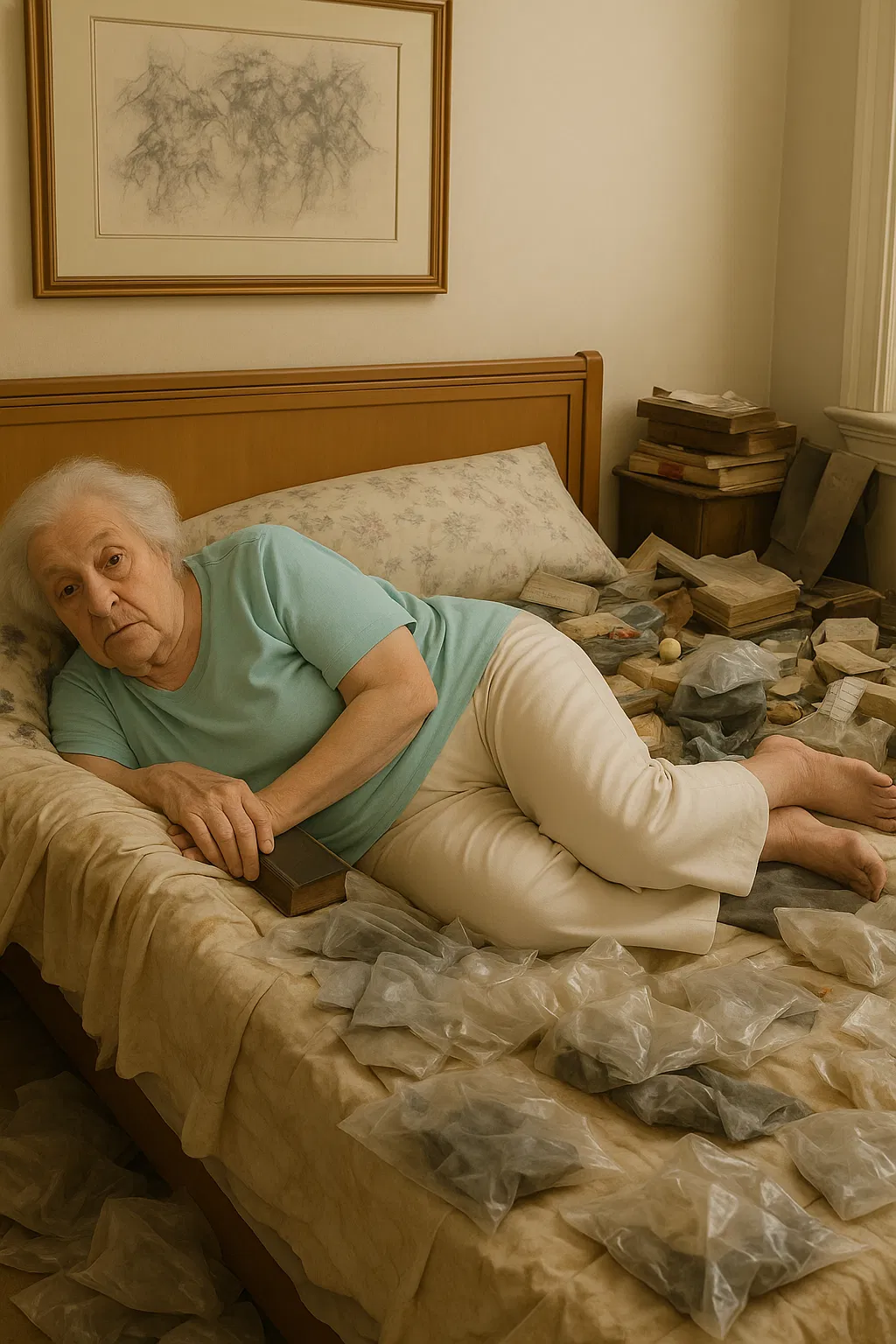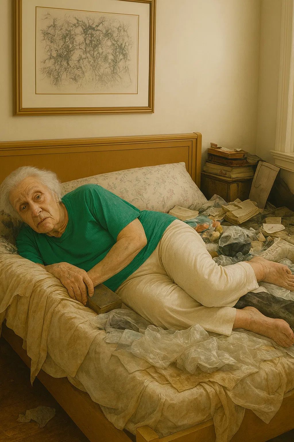 Mom was lying on the bed, covered with old rags. She wore a faded green T-shirt that once fit her well but now hung loosely. Her face was sunken, her hair completely gray, her skin aged—as if ten years had been added in one day. Chaos surrounded the bed: bags, dirty clothes, empty medicine boxes, papers, garbage. The smell was suffocating—a mix of mold, medicine, and a long-neglected room.
