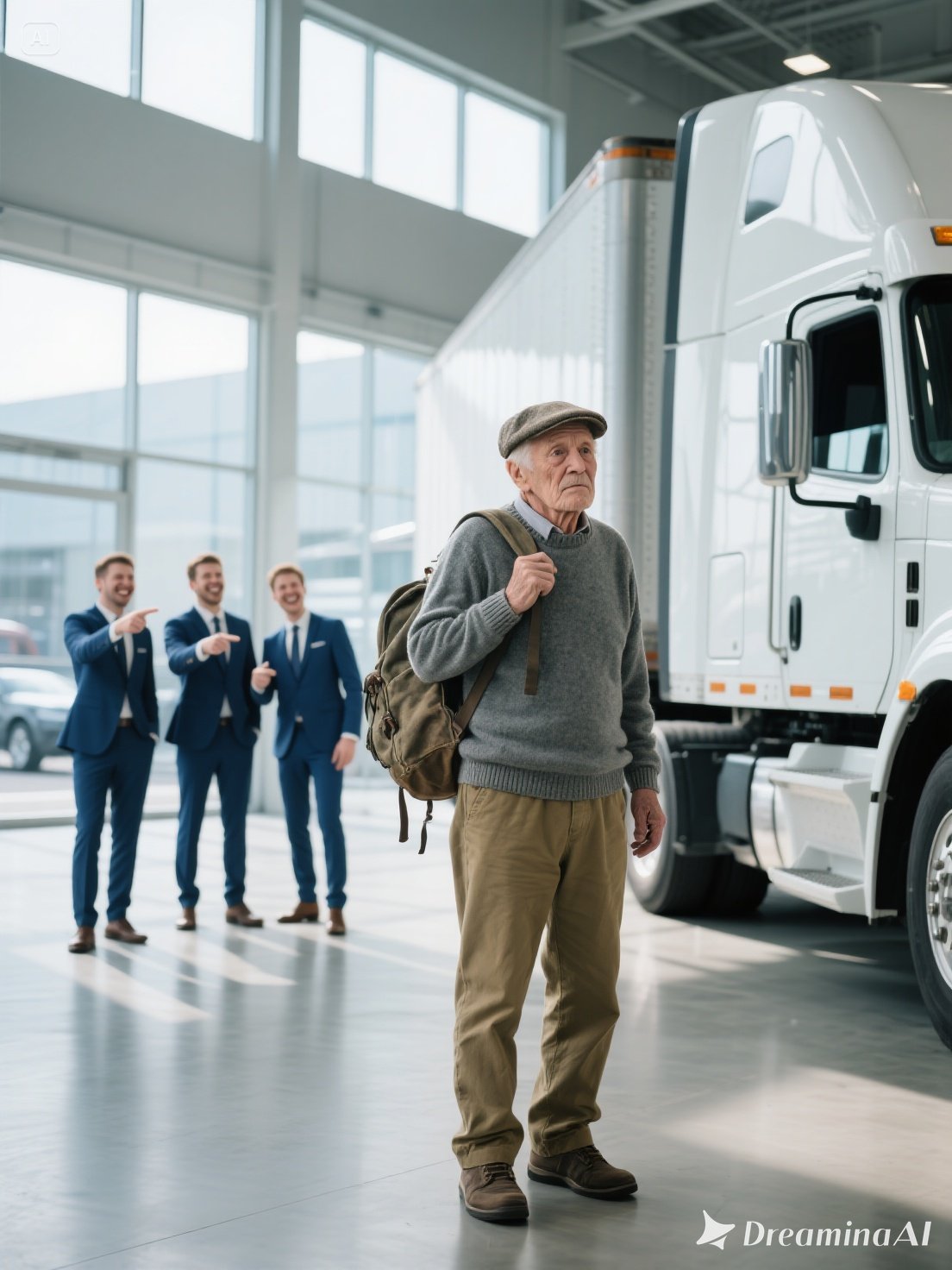 He said his goodbyes and walked toward the exit. This time, the three salesmen followed him — not out of obligation, but out of genuine respect. They watched him climb into his old truck once more, its rusty frame glinting in the sun.