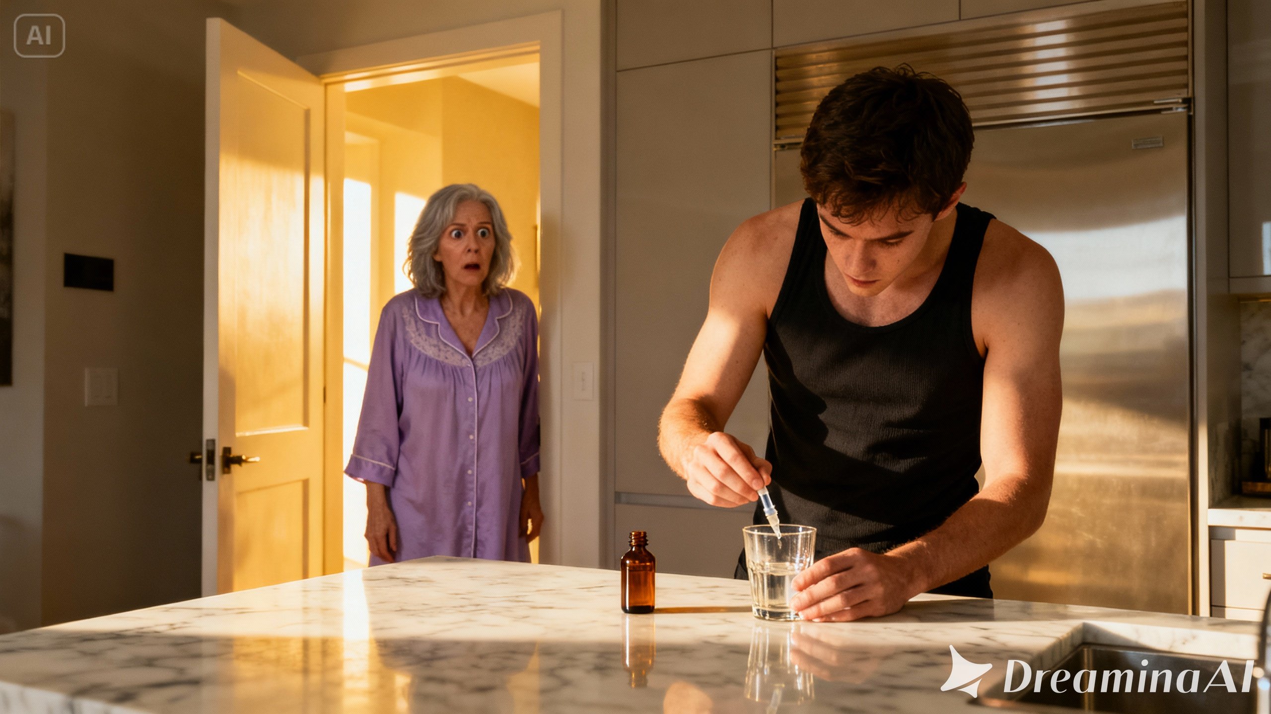 He stood by the counter, humming softly. I saw him pour warm water into my usual glass, open a drawer, and pull out a small amber bottle.