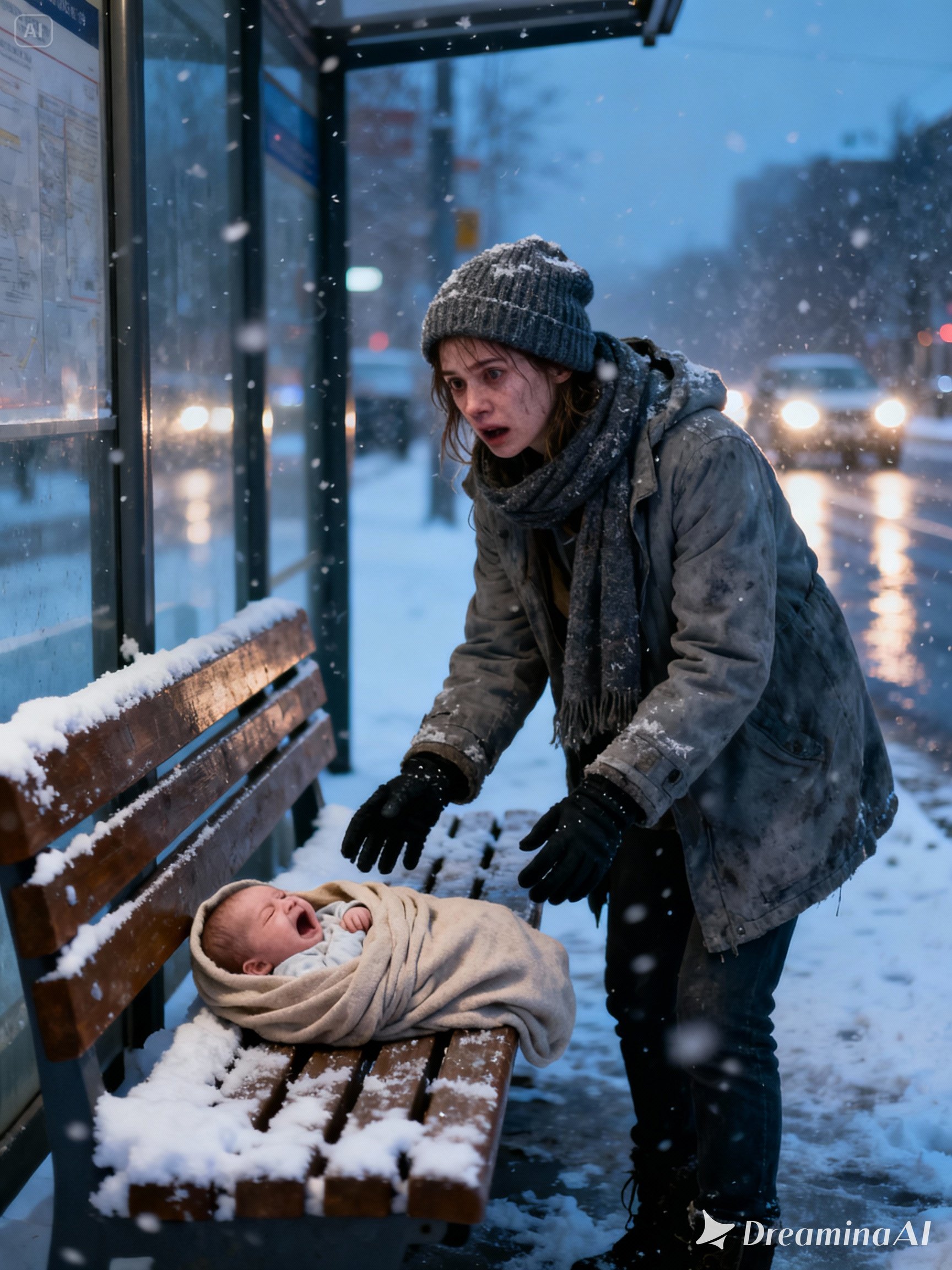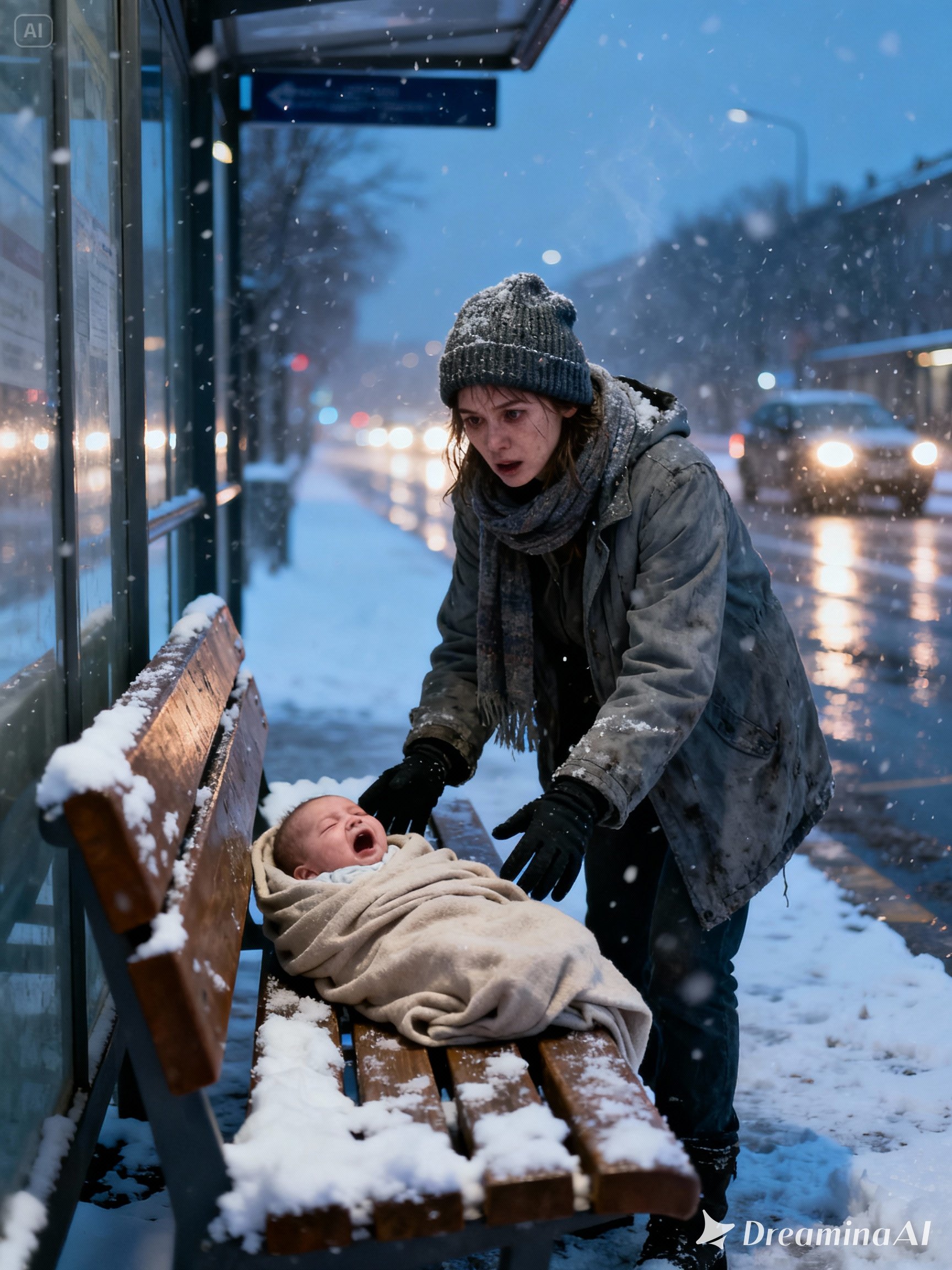 So faint I almost imagined it. But there it was again—a thin, weak cry full of fear and pain. I followed it to a bus stop, and what I saw nearly stopped my heart: a tiny newborn, wrapped in dirty, thin blankets, shivering violently on a cold metal bench.