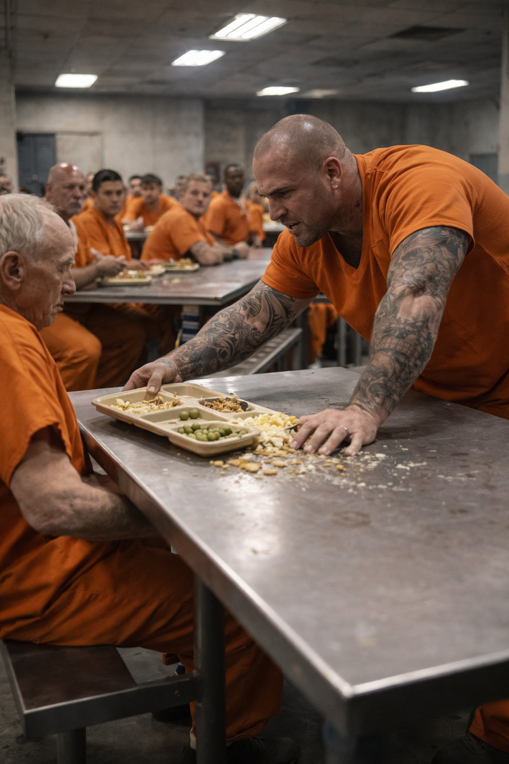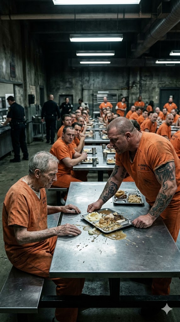The dining hall was filled with the clatter of trays and low murmurs. The old man calmly chose an empty table, set his tray down, and began eating, ignoring the stares piercing him from every corner. He didn’t know—or didn’t care—that no one had the right to sit there.