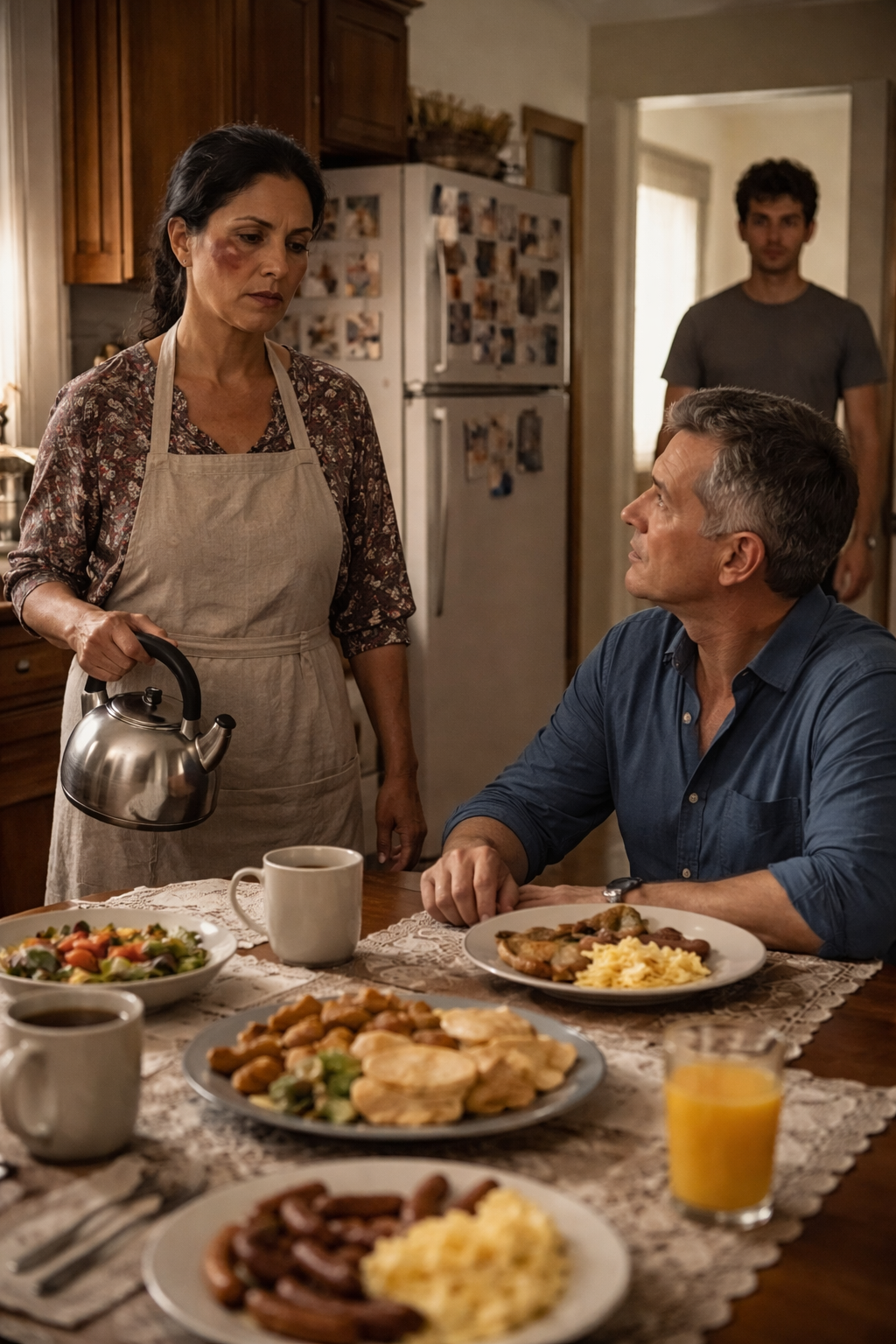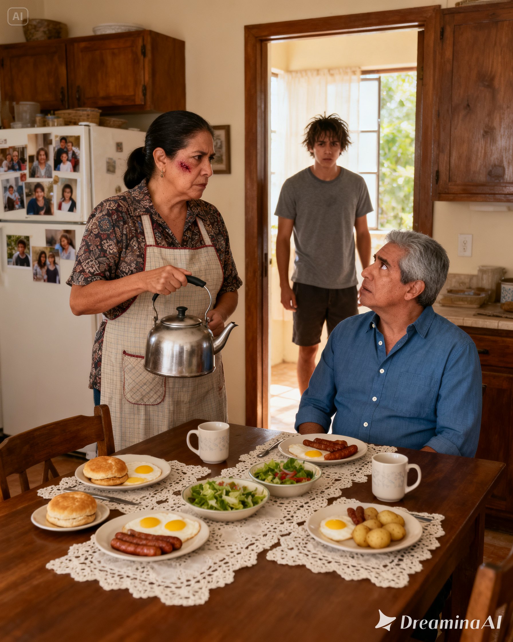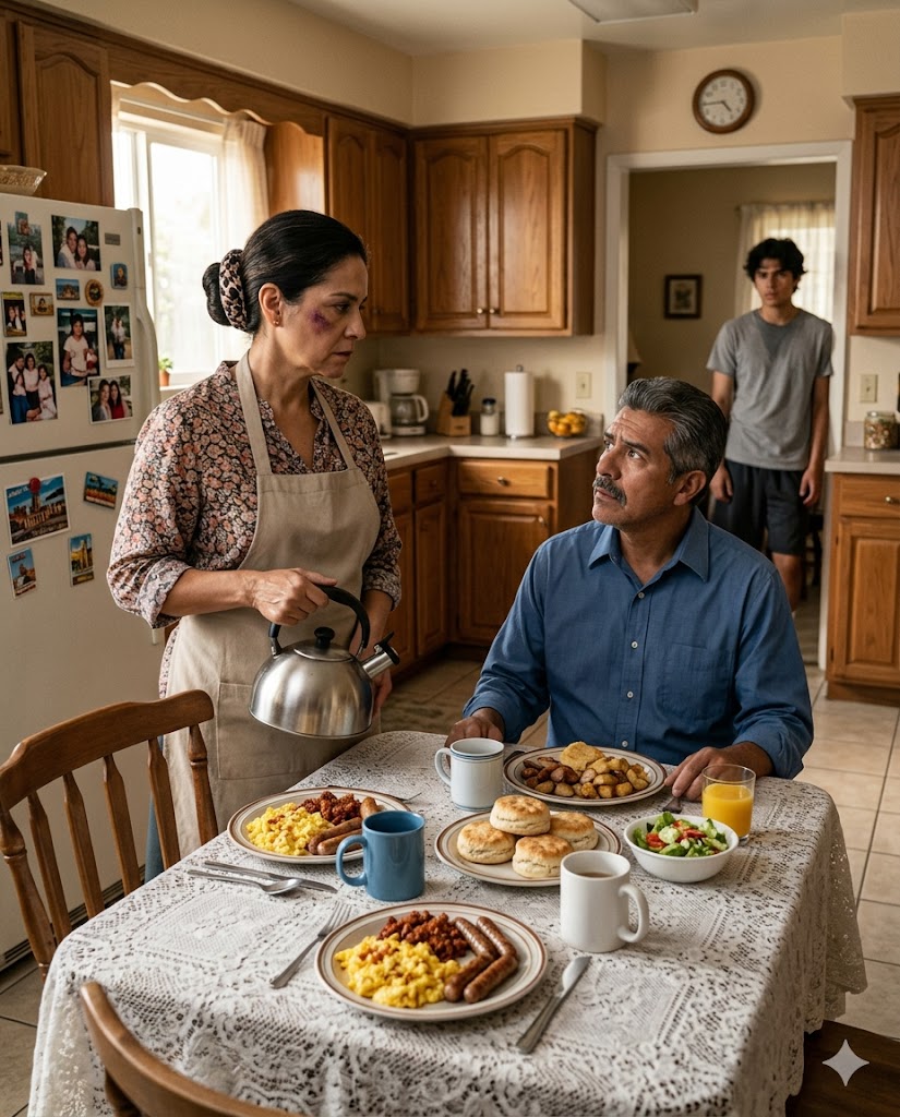 Diego looked at the table. The chilaquiles were no longer steaming. The coffee was growing cold. The embroidered tablecloth felt absurd under all that tension, as if it belonged somewhere else entirely. Then he whispered: