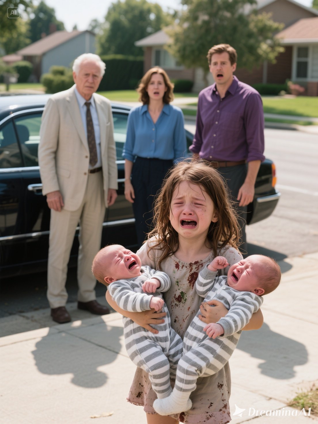 The little girl hugged them tightly, her bare feet trembling on the pavement. Suddenly, a luxury car pulled up. A man stepped out and, with a single sentence, changed the fate of the three children forever.