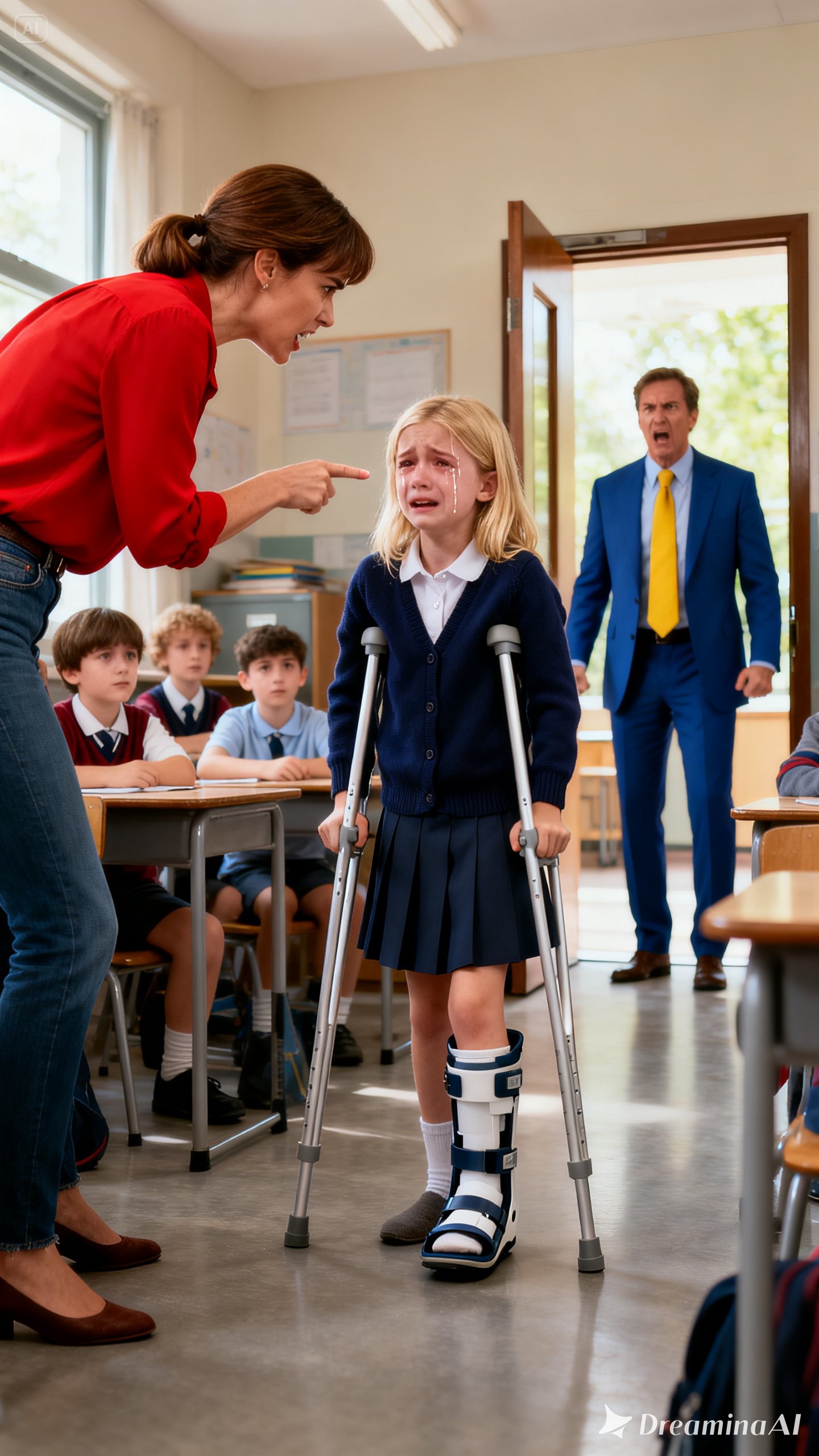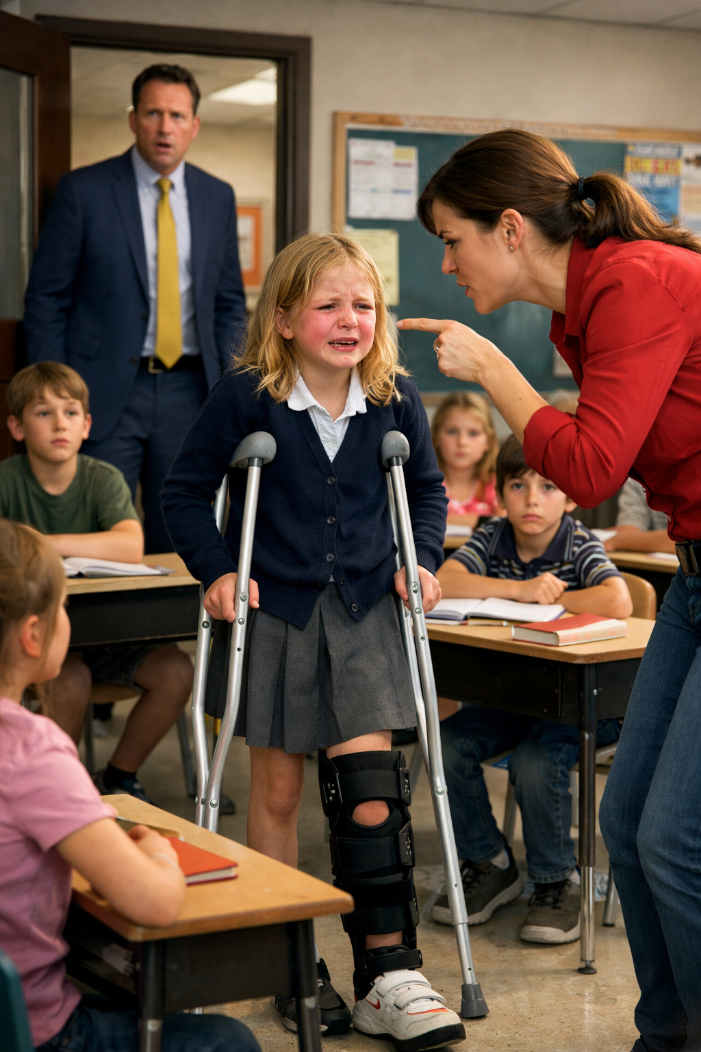 One crutch had slipped away from her. Her prosthetic leg lay awkwardly twisted beneath her skirt. Several children stood around her, phones raised, recording. One boy mocked the way she walked. A girl laughed so hard she leaned on a desk to steady herself. At the front of the room, their teacher, Ms. Harper, made no move to help. She folded her arms and said with cold irritation, “Ella, you need to try harder not to make everything into a scene.”