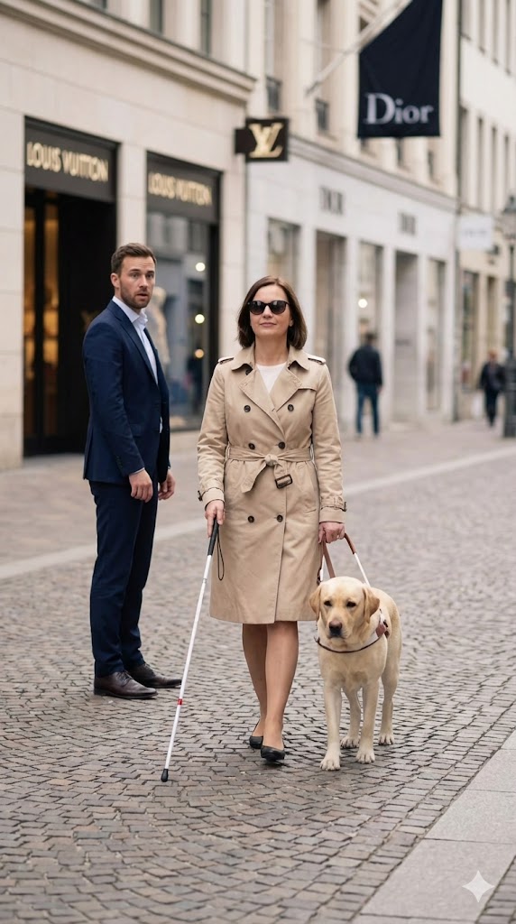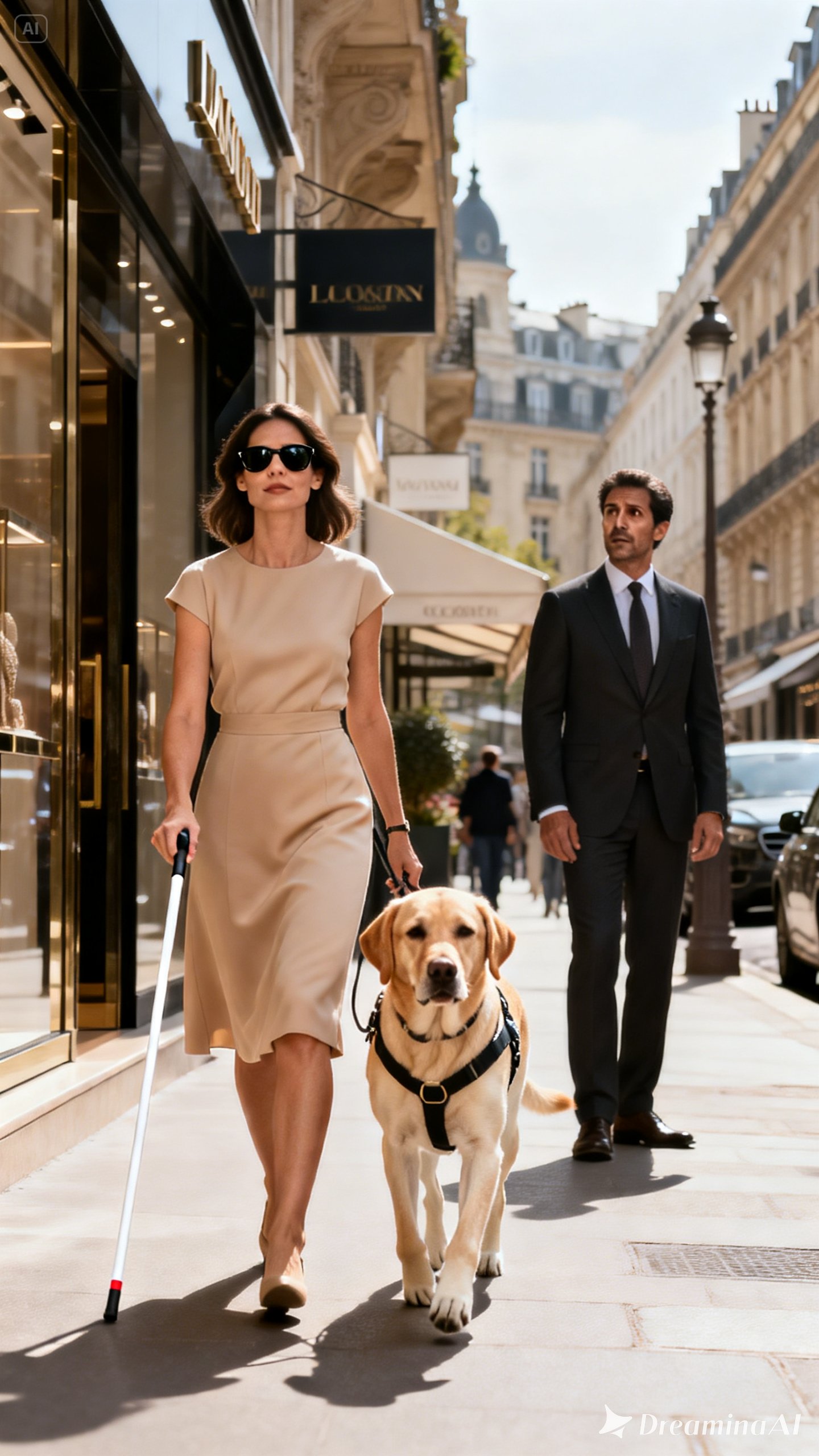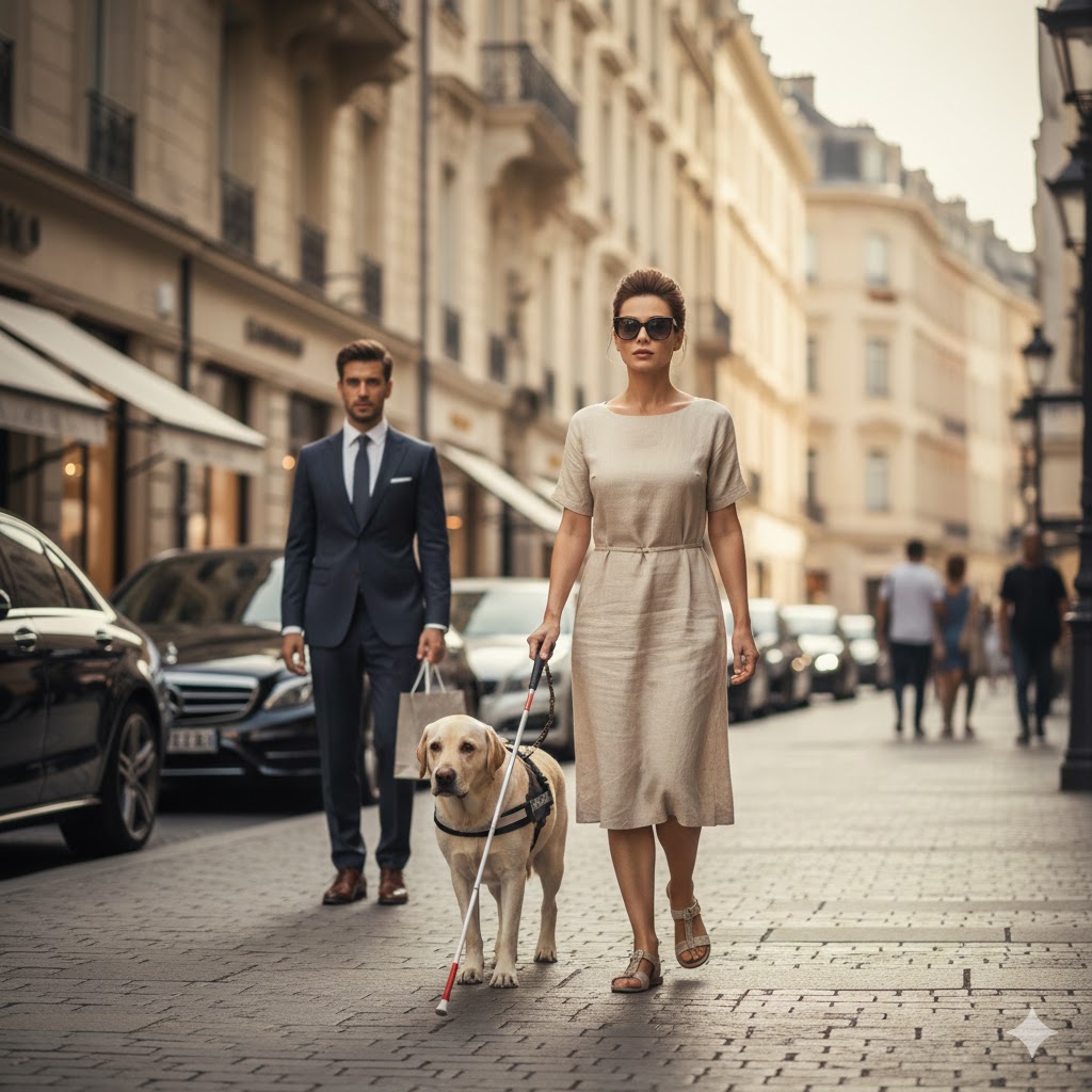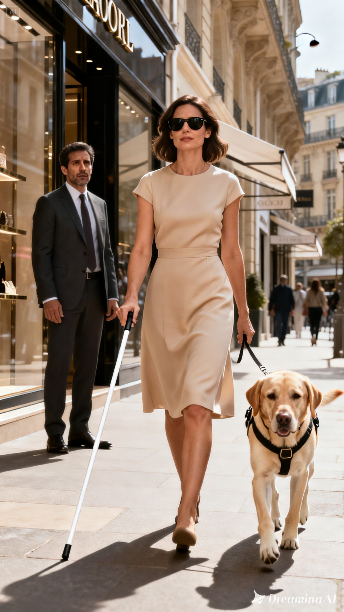 A woman moved between the café tables with an elegance that seemed almost unreal. She neither hurried nor lingered; she simply flowed. She wore a simple white linen dress that danced with the breeze, her brown hair cascading in soft waves over her shoulders. But what truly captured Baltazar’s attention—and that of nearly everyone present—was not only her calm beauty, but the companion at her side. Walking beside her with quiet confidence was a stunning golden Labrador Retriever, fitted with a harness and rigid handle.
