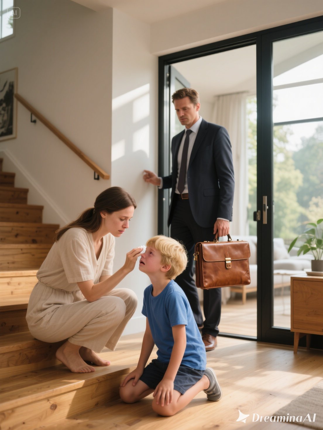 On the staircase sat his eight-year-old son, Oliver, eyes red with unshed tears, a dark bruise blooming on his cheek.