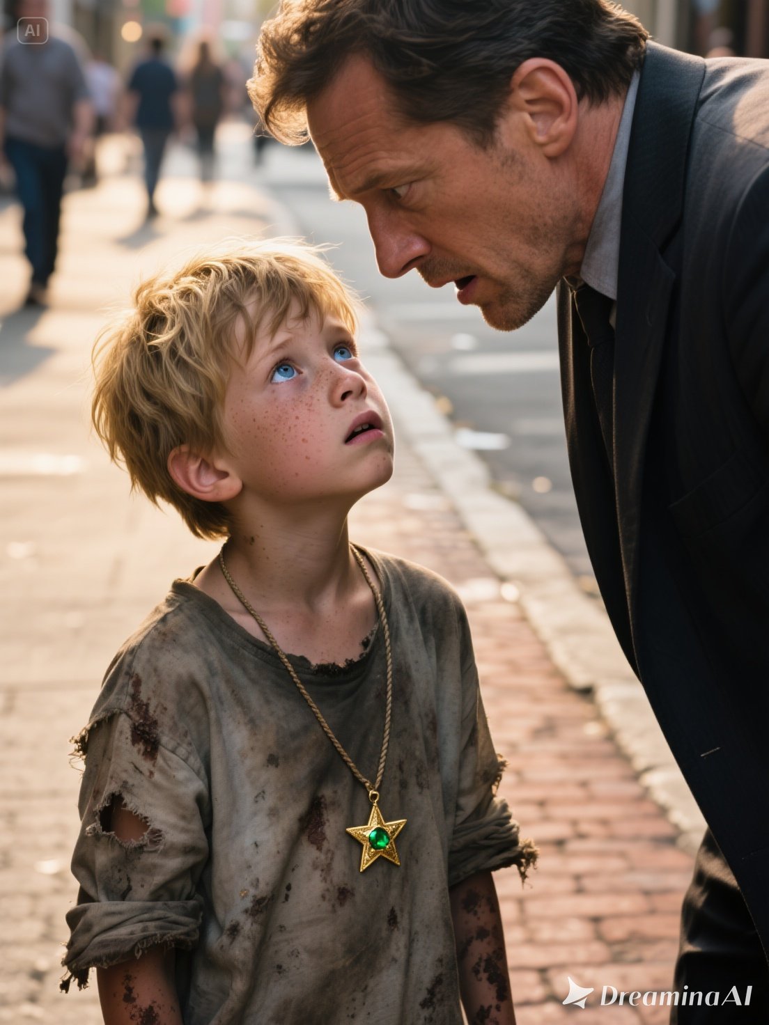 Thomas Michels’ world shattered the moment he saw the street boy sitting on the sidewalk, barefoot and filthy, a plastic bag clutched to his chest—and around his neck, a necklace that stopped Thomas cold. It was a gold star-shaped pendant with a small emerald in the center. He knew it intimately. Only three existed. One had belonged to his daughter, Sofia, who vanished five years ago without a trace.
