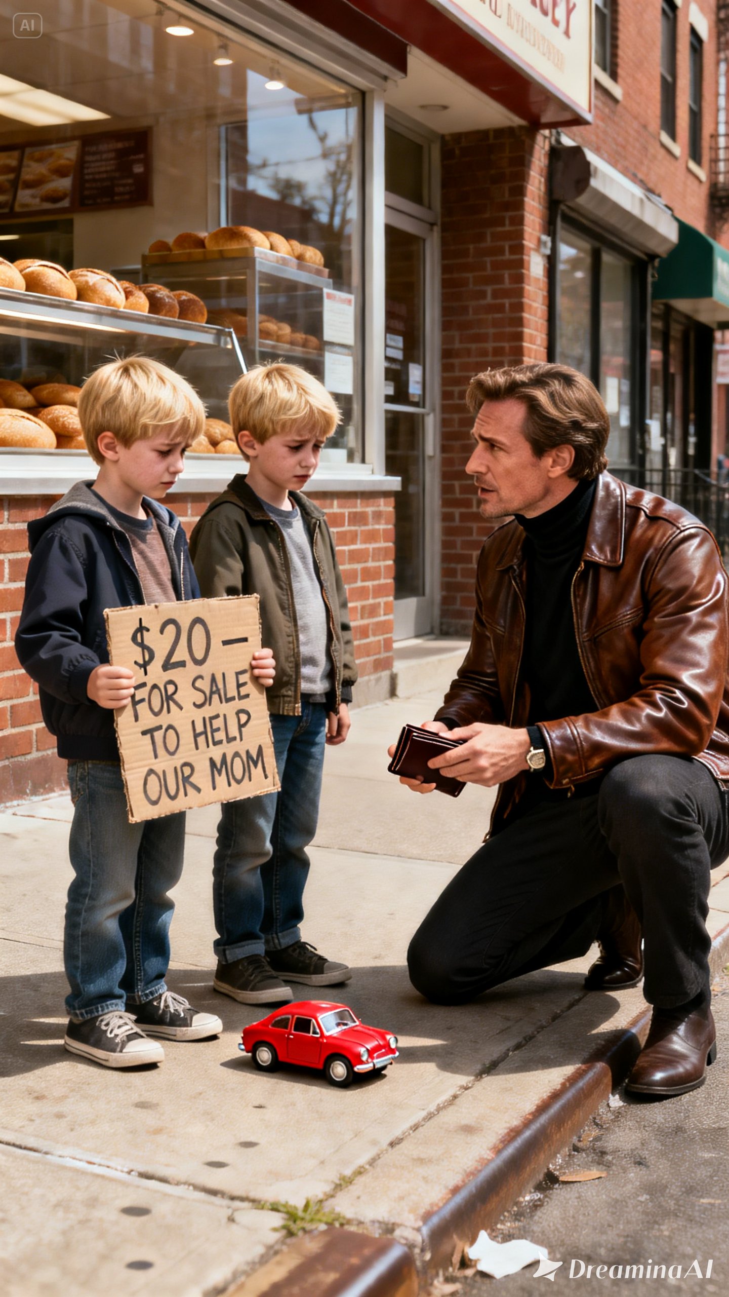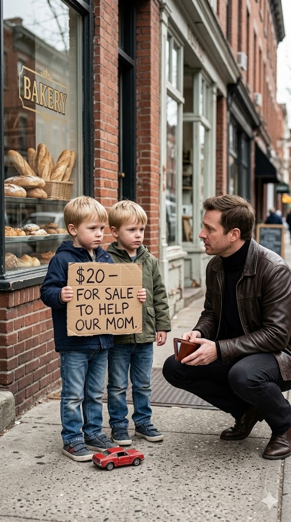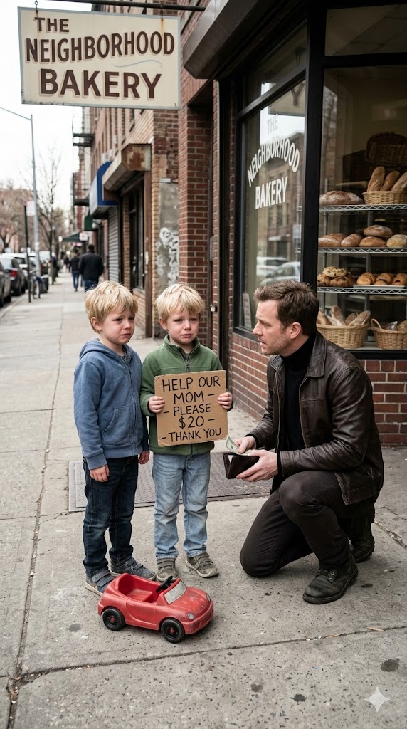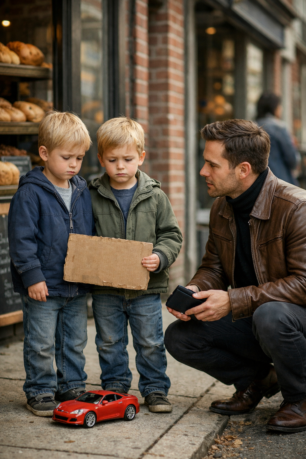 Outside a small bakery, two little boys stood beside a worn red plastic toy car. One held a cardboard sign written in shaky letters: