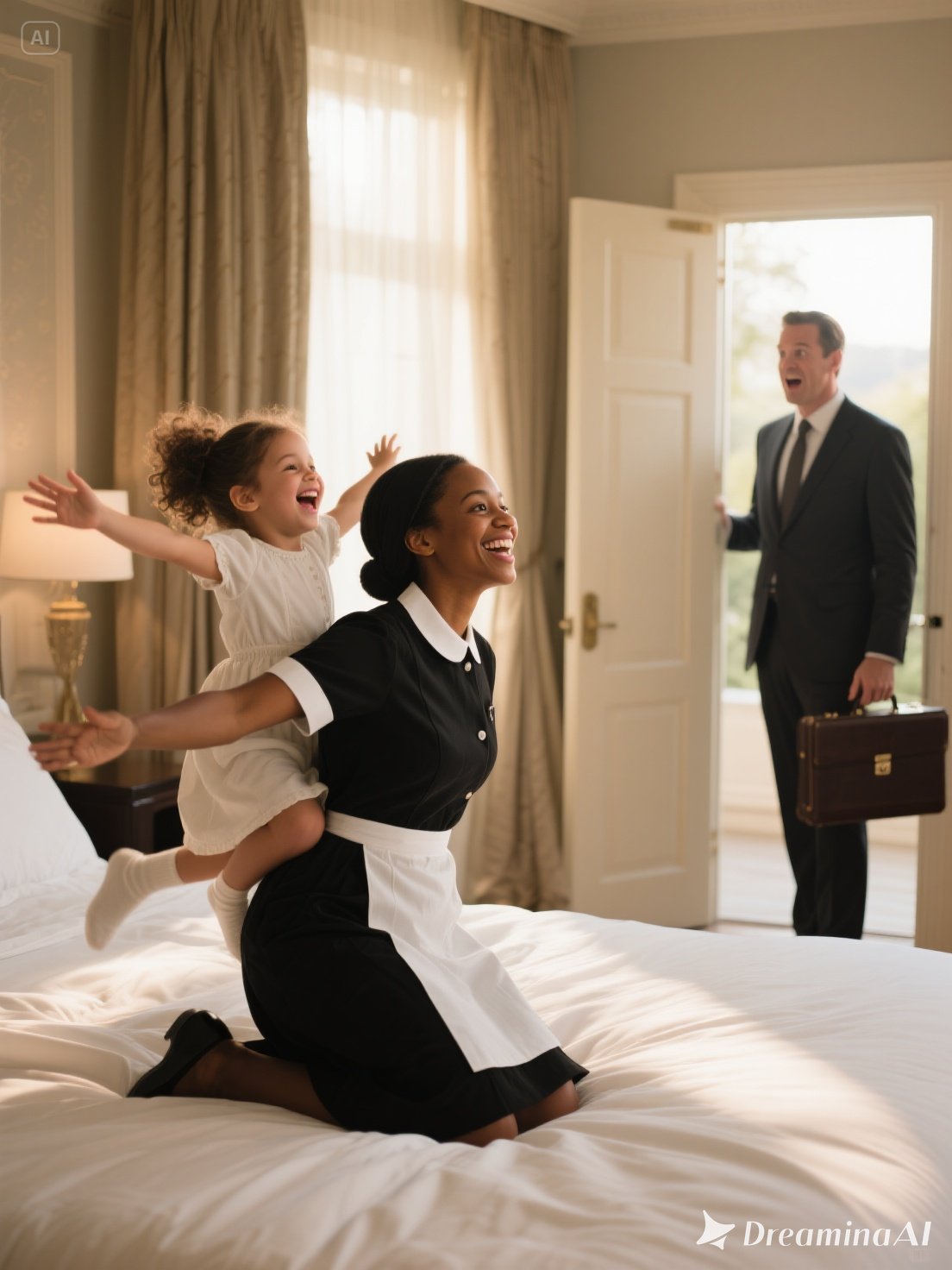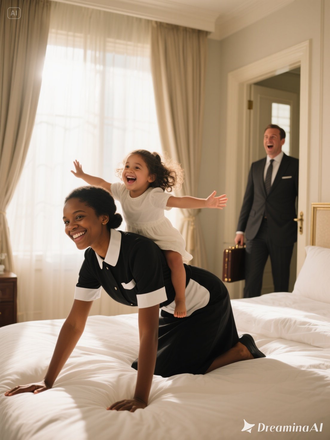 There, in the center of the bed, was Amara—the new maid he’d hired two weeks ago. Her dark hair was neatly tied back, her back straight like a platform. And on top of her, giggling uncontrollably, was Ella. Ella, whose legs had always hung limp. Ella, who had never crawled, let alone stood. Now, she was balanced on Amara’s back, her tiny legs gripping for support, her entire body shaking with laughter.