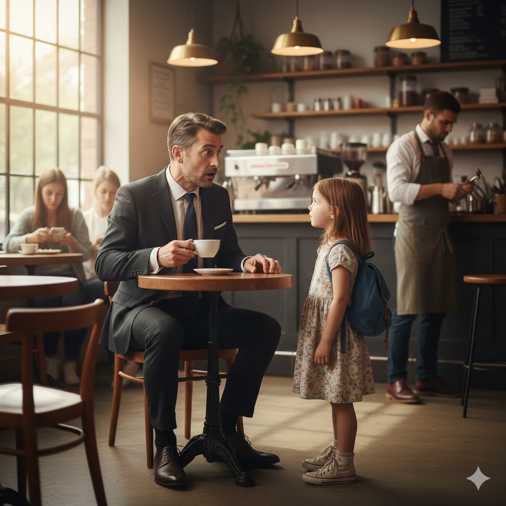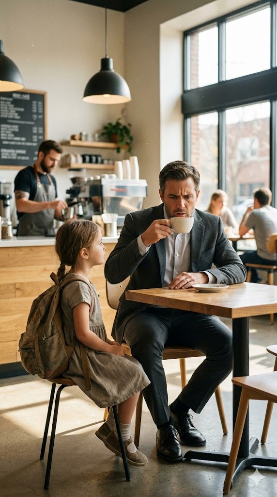 She walked straight to his table, stopped, straightened her shoulders, and said calmly, “Mommy is sick today. So I came instead.”