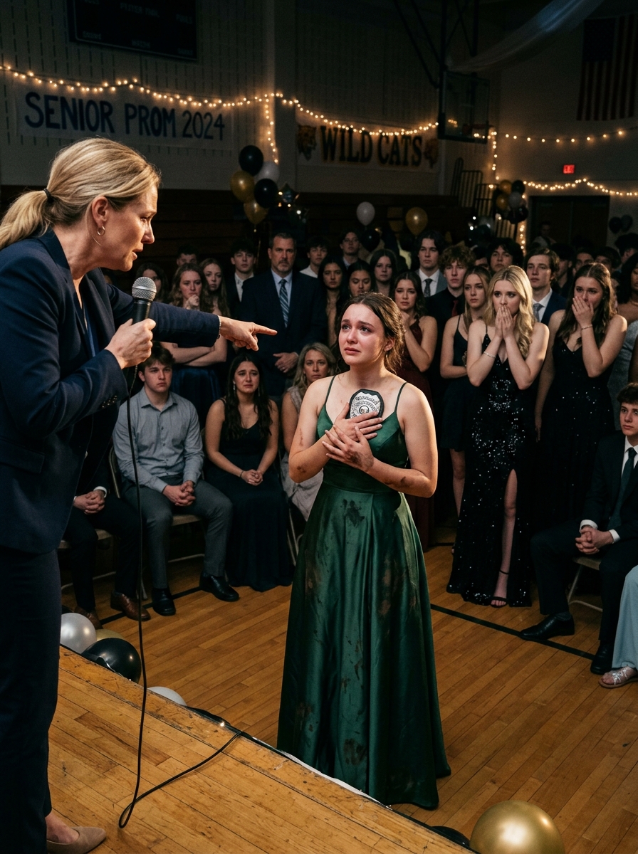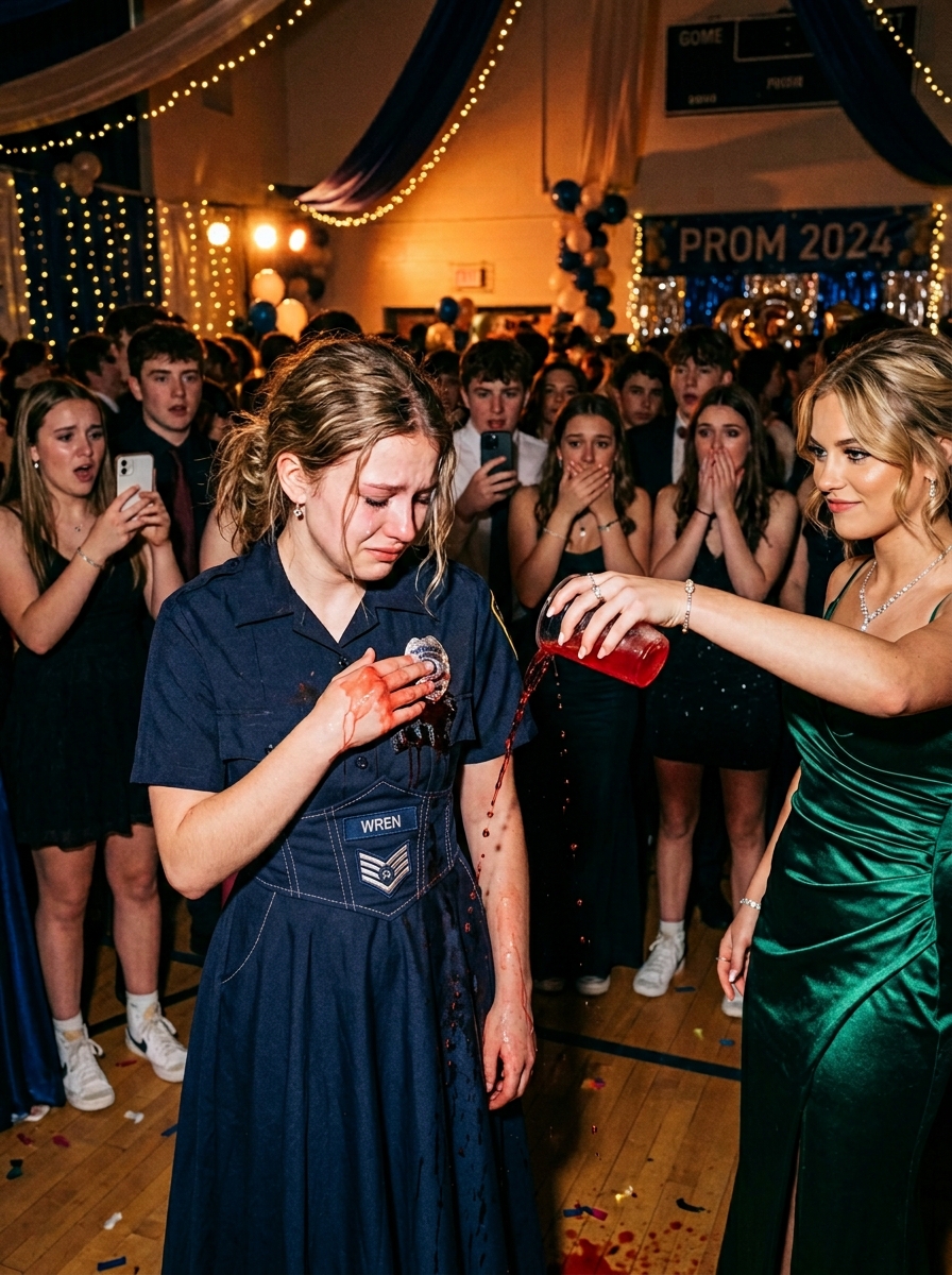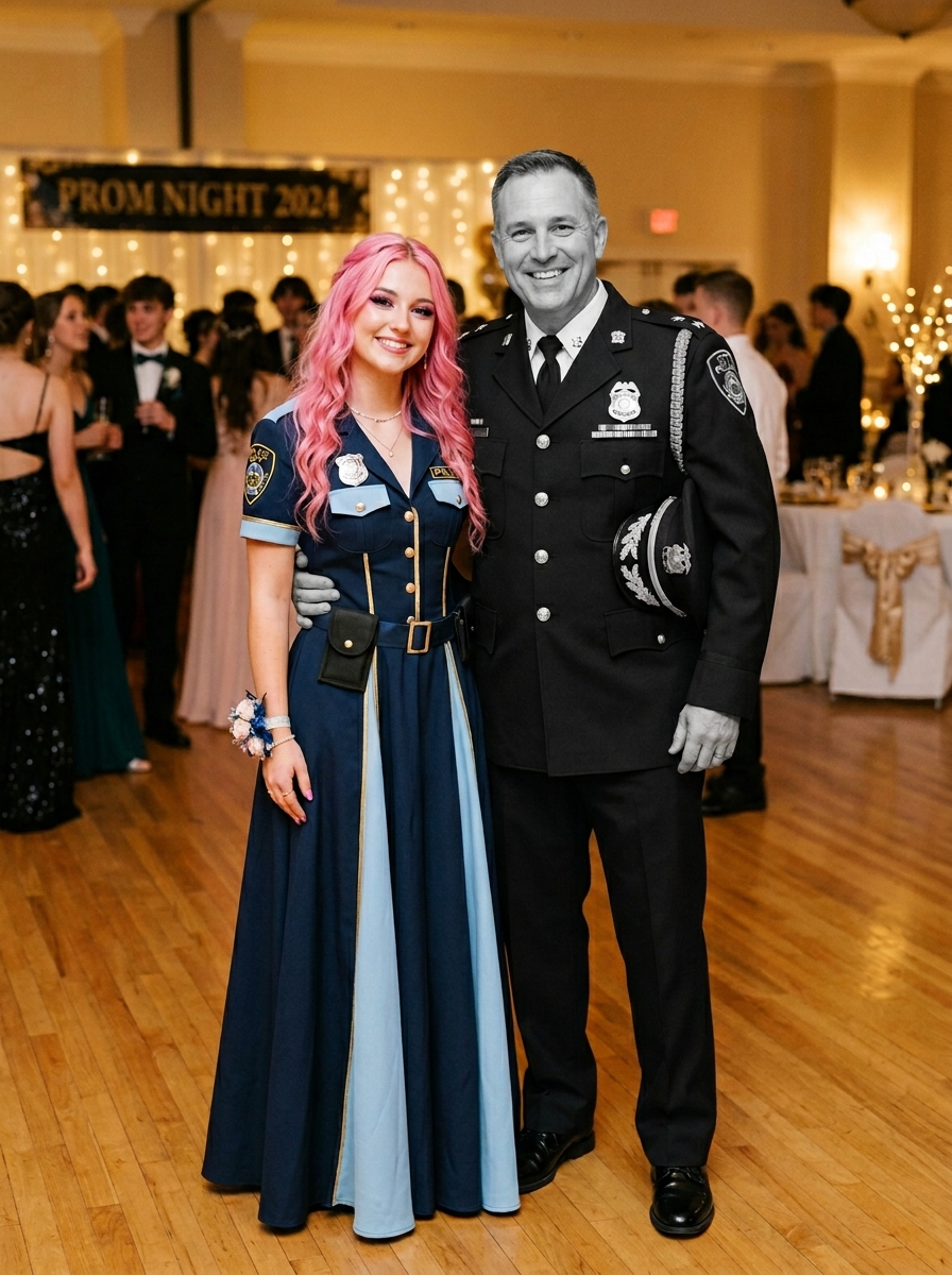 My daughter wore a prom dress she had made from her late father’s police uniform. When a girl dumped punch all over it, she didn’t scream or cry—she just stood there, desperately trying to clean his badge. Then the girl’s mother took the microphone… and revealed something no one had seen coming.