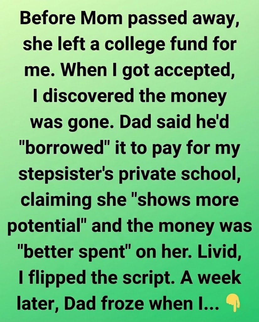 My dad eventually sat me down and explained that he had “borrowed” the money to pay for my stepsister’s private school tuition and academic programs. According to him, it was a “necessary” decision because she “shows more potential” and is “a brighter student” who “deserves every opportunity to succeed.” He even added that it would be a “waste” not to invest in her future, implying that mine wasn’t worth the same.