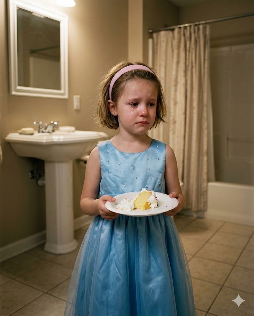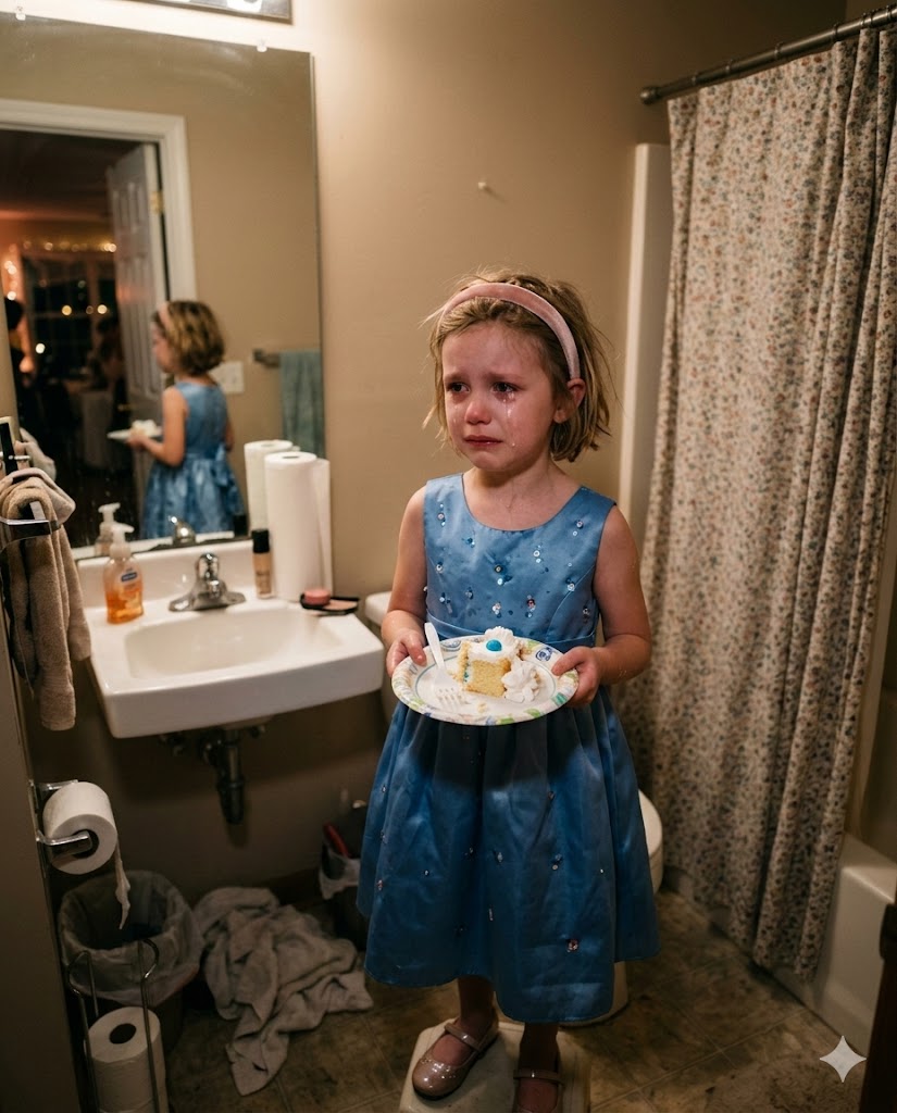 Juniper was sitting on the bathroom floor in her floral dress, hugging her knees. When she looked up at me, her face was far too calm for a child hiding in a bathroom during her father’s wedding.