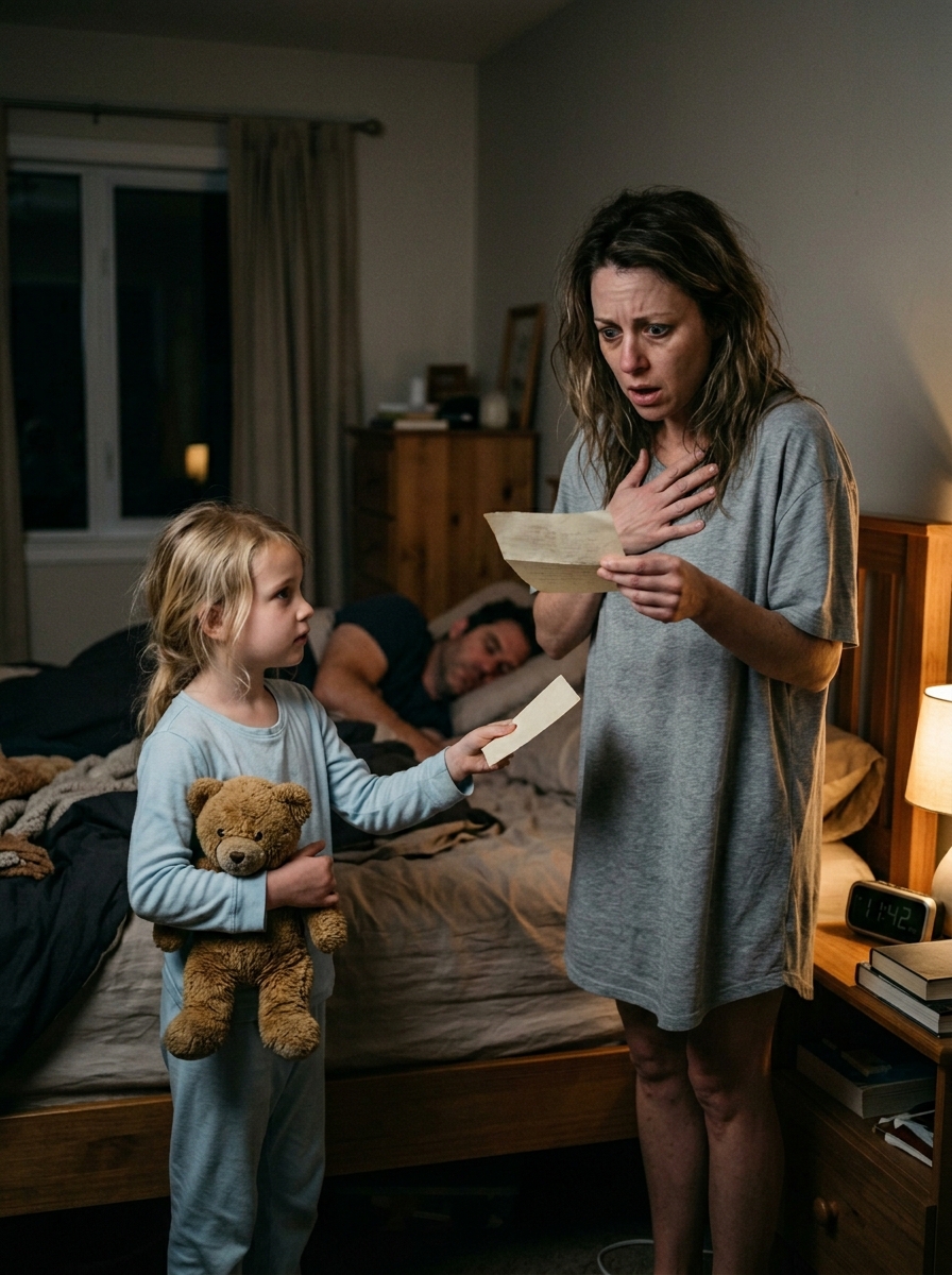 She was wearing her flannel pajamas with the small foxes on them. She was clutching Mr. Buttons against her chest, and in the dim light from the hallway I could see that she was trembling — not from cold.