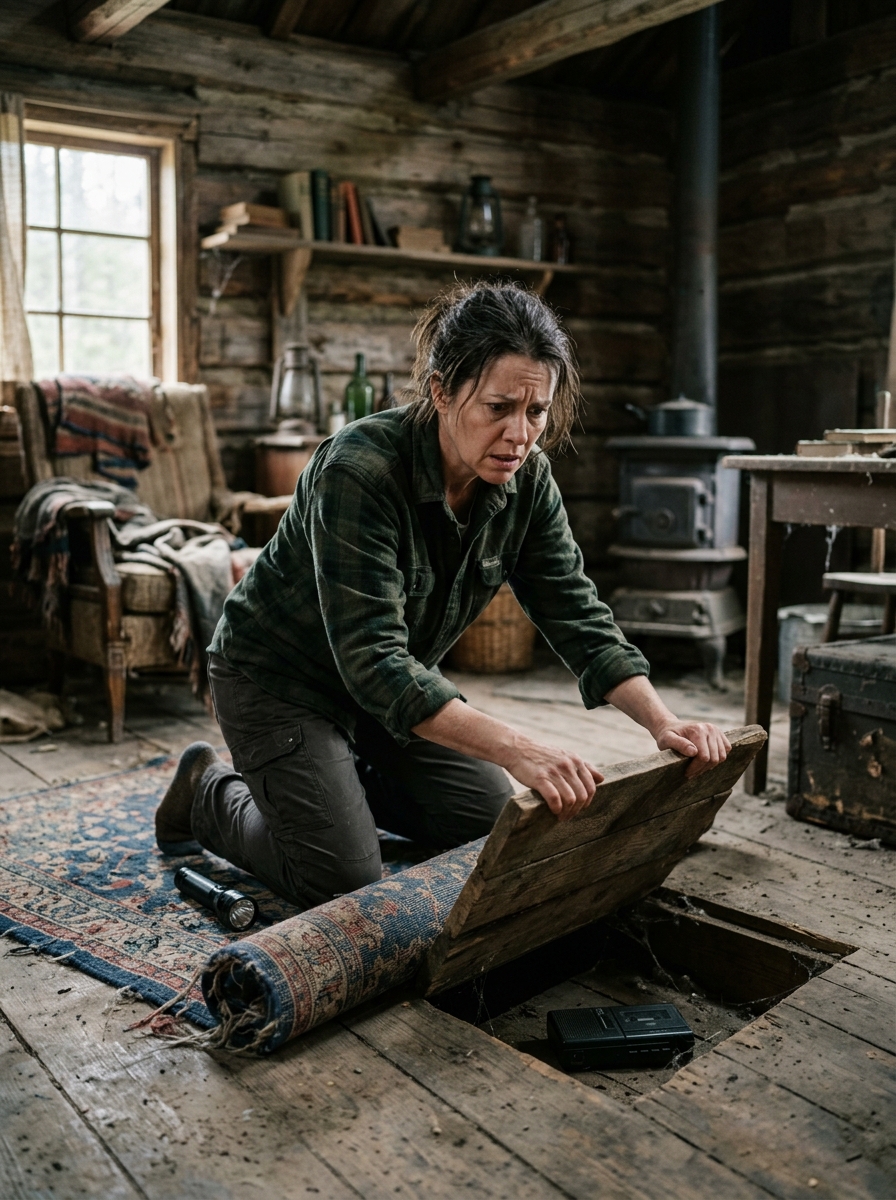 I walked to the center of the main room and looked down at the braided rug — old, oval, faded red and brown, the kind that existed in ten thousand rural cabins across the country. I crouched down and pulled back one edge.