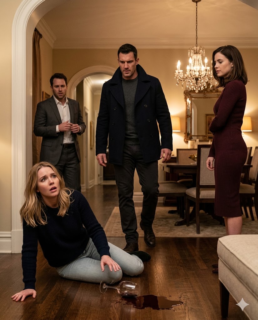The man in the doorway was tall, broad-shouldered, wearing a dark blue coat, with the expression of someone who already knew everything was about to go very wrong. He entered, and before he could speak, Valeria turned, saw him… and immediately went pale, dropped her glass, and screamed: