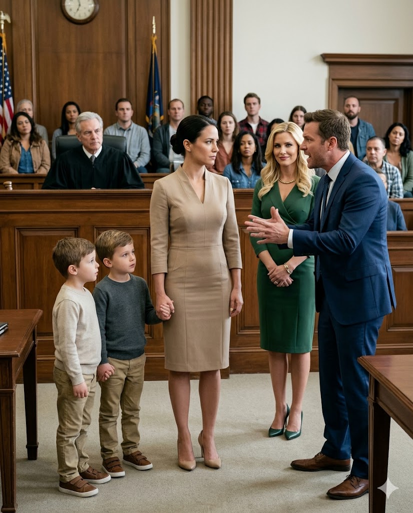 In each hand she held the small fingers of two identical boys who walked beside her in complete silence, their dark blazers buttoned and their shoes polished bright. The twins moved with an eerie calm, their eyes observing the courtroom with a maturity far beyond their years.
