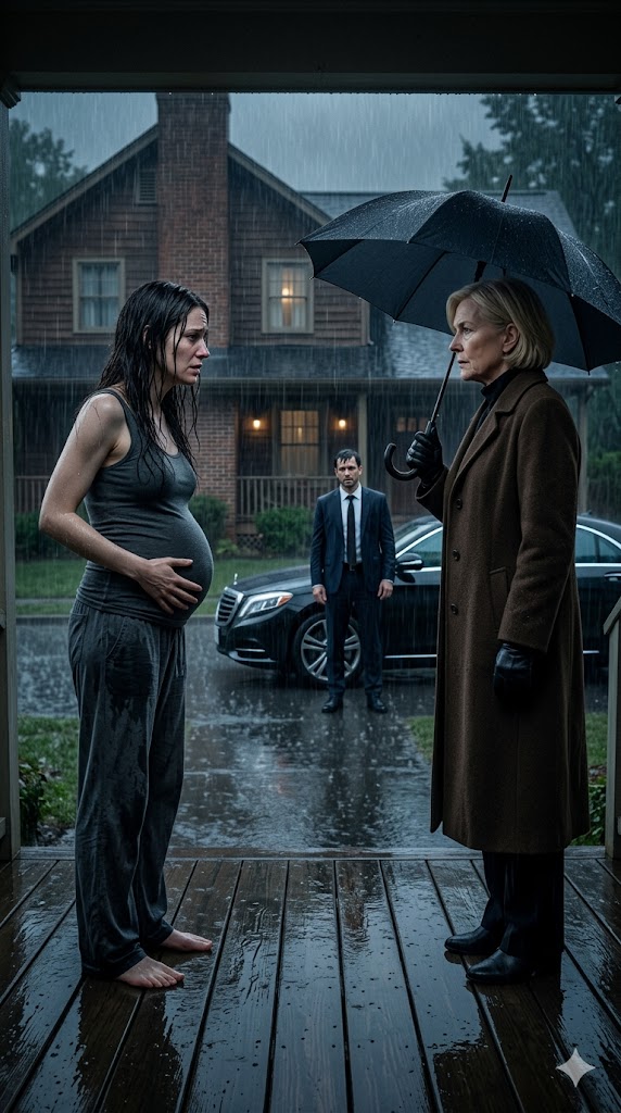 The rain fell relentlessly, hammering against the wooden porch, streaming down the steps, and catching the dim glow of the streetlamp. Each droplet felt like it was trying to seep into my very bones. My thin house clothes clung to me, soaked through, the fabric sticking uncomfortably against my skin. My hair was plastered to my face. My fingers, stiff and numb, barely obeyed me. Behind me, the door remained closed — the same door Michael had slammed shut just ten minutes earlier, as if the sound of it could erase my presence entirely.