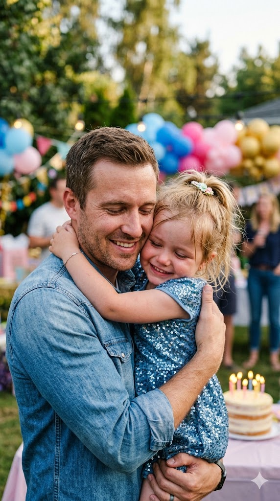 We celebrated in our backyard with paper lanterns and a homemade cake. After opening her gifts, Ellie climbed into Daniel’s lap, wrapped her arms around his neck, and whispered:
