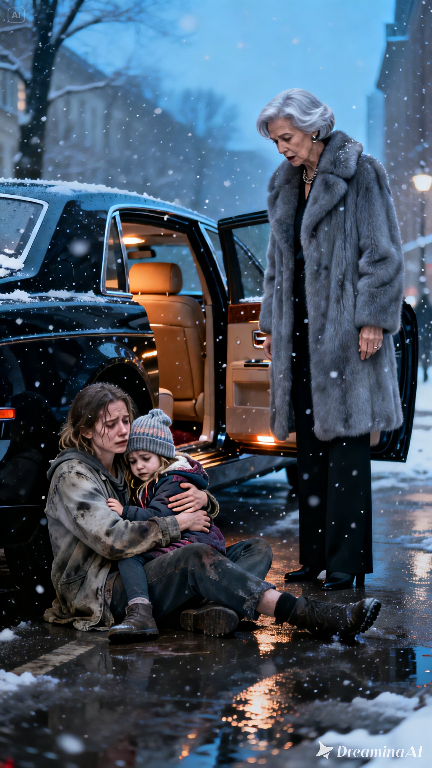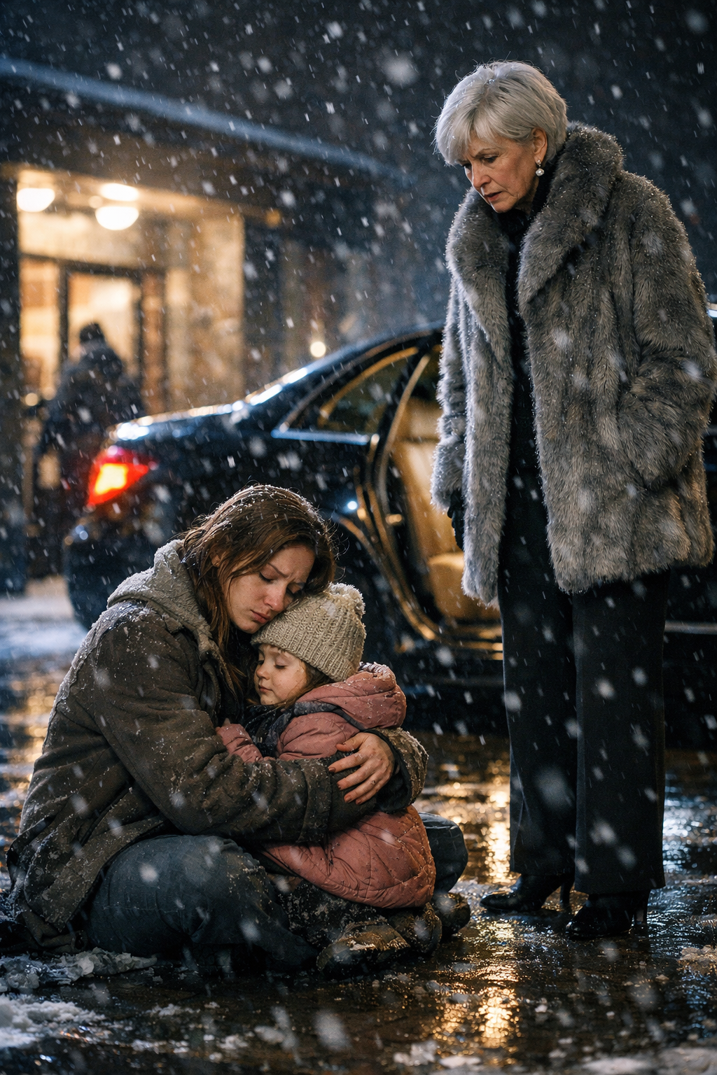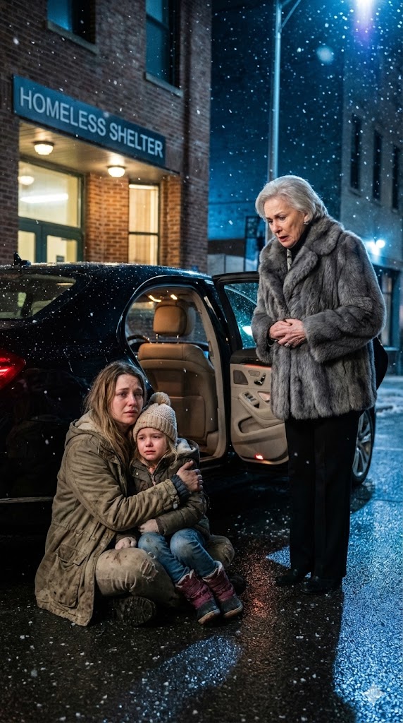 As Sophie and I waited in line, a glossy black Rolls-Royce stopped in front of the shelter. It looked out of place against the broken sidewalk and buzzing streetlamp. An elderly woman stepped out, wrapped in a fur coat, pearls perfectly arranged at her throat. Staff hurried to shield her with umbrellas. She was obviously there to donate.