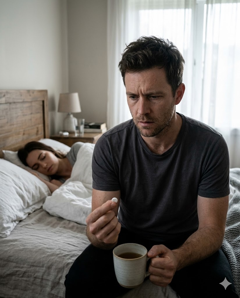I lay perfectly still beneath the blanket, breathing carefully, letting my eyelids stay half-closed as if sleep had already carried me somewhere deep and unreachable.