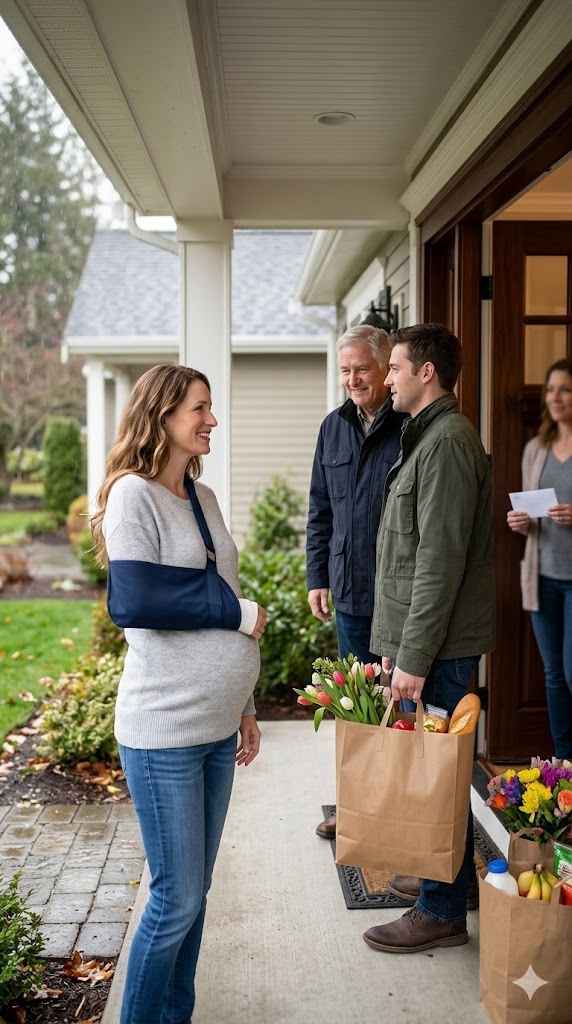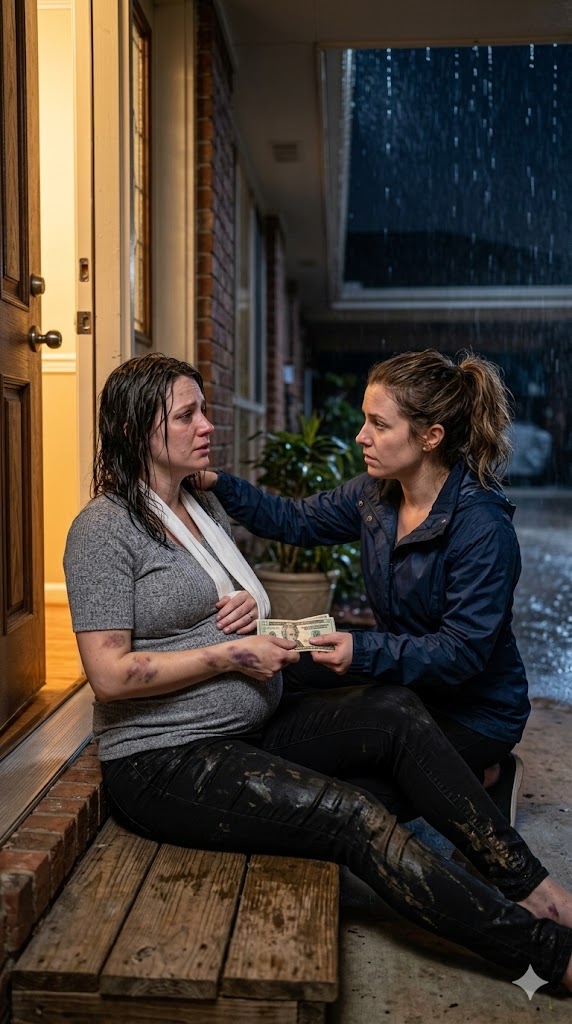 Standing there was my neighbor from two houses down. She was eight months pregnant—her swollen belly obvious beneath a thin sweater soaked by the rain. Her hair clung to her cheeks, and her eyes were red and puffy from crying. One arm hung stiffly at her side, supported by a makeshift sling and already turning a deep shade of purple.